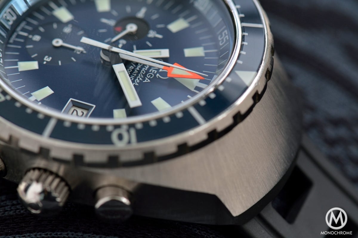 Many collectors refer to the weight and the height of the watch, which do create some problems. First, Omega sold the watch either with the flightmaster style bracelet, the mesh bracelet, or with an isofrane waterproof strap. These make the watch extremely comfortable, however any attempt to change to a thinner strap might lead to an unbalanced feeling on the wrist. Second, the height of the watch means that it’s very easy to pick up damage on either its case or its bezel. Since these watches were extremely expensive (CHF 715 in its year of introduction) and marketed as tool watches, they were mainly bought by people who actually used them on the job (i.e., on dives); this exposure took a toll on the watches. If we put in the equation the small production run of the model, it is very difficult to find a perfectly preserved Big Blue in original condition on the market at the moment. If you do, the price is high.