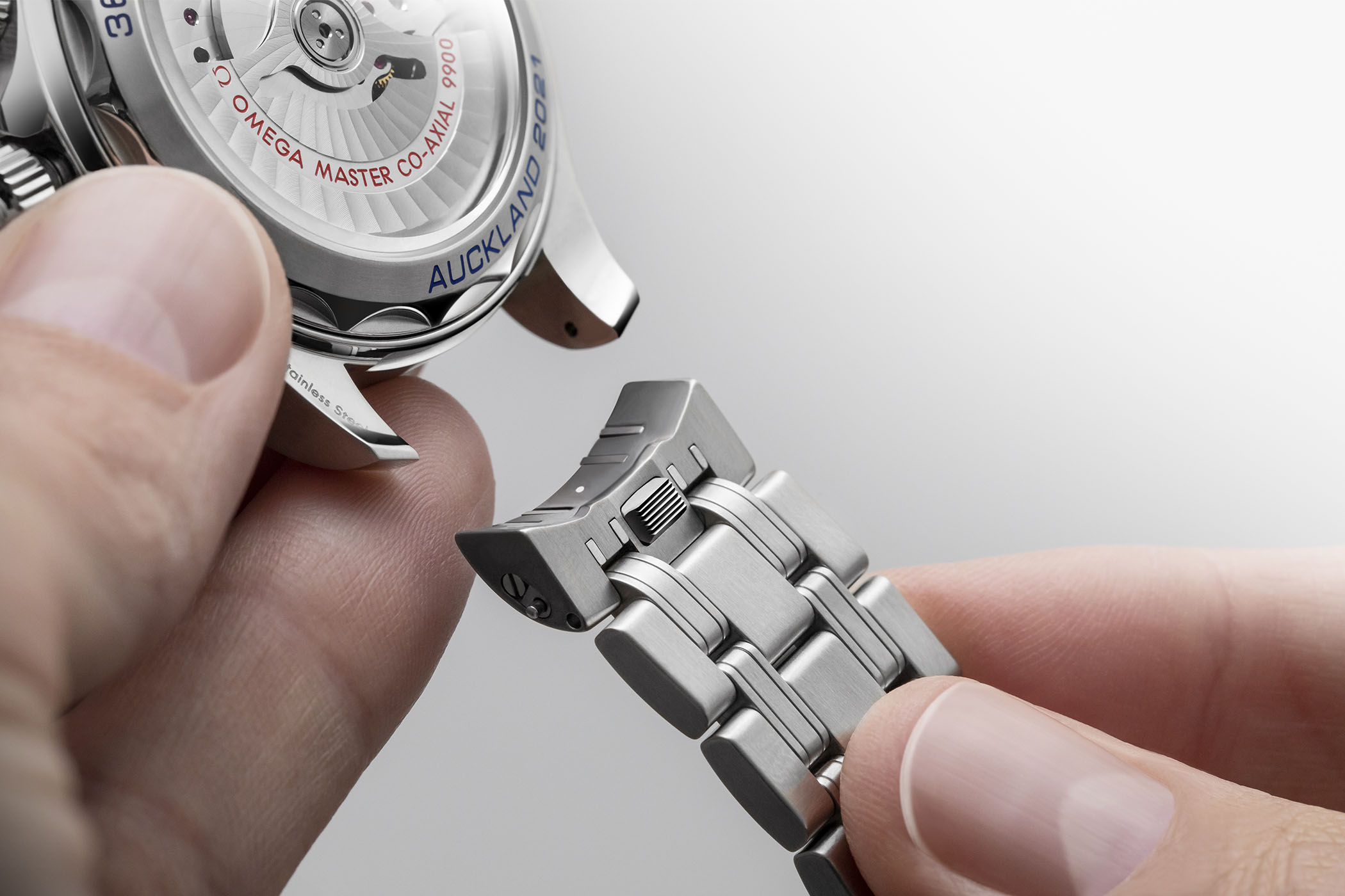 Omega also uses this new Seamaster Diver 300M America’s Cup Chronograph to introduce a new concept, its patented Quick Change system. The watch is delivered with a stainless steel bracelet and a blue rubber strap and both feature a button on the back. A simple press releases the pins from the watch-head, enabling the wearer to switch easily between the bracelet and the strap without having to use tools.