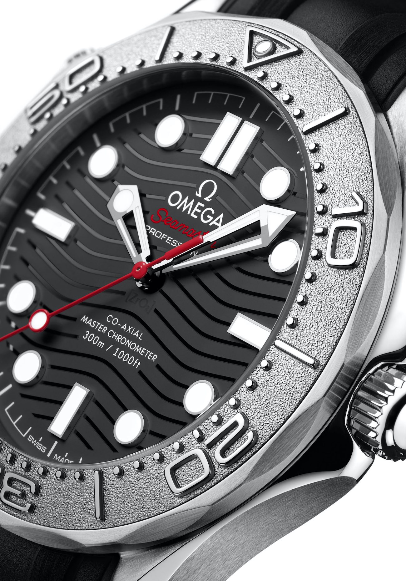 The black ceramic (ZrO2) dial has a sleek matte finish and the laser engravings marking the iconic wave pattern are sharp, well defined and polished (also in positive relief) – in the same vein as the Ceramic version here. Other elements on the dial conform to the traits of the Seamaster Diver 300M family, like the large applied luminous plots and the skeletonised hands, also treated with Super-LumiNova. A touch of red enlivens the monochromatic scenery with the Seamaster inscription on the dial and the central seconds hand. The exclusion of a date window will be welcomed by many and certainly adds to the instrumental look of this Nekton Edition.