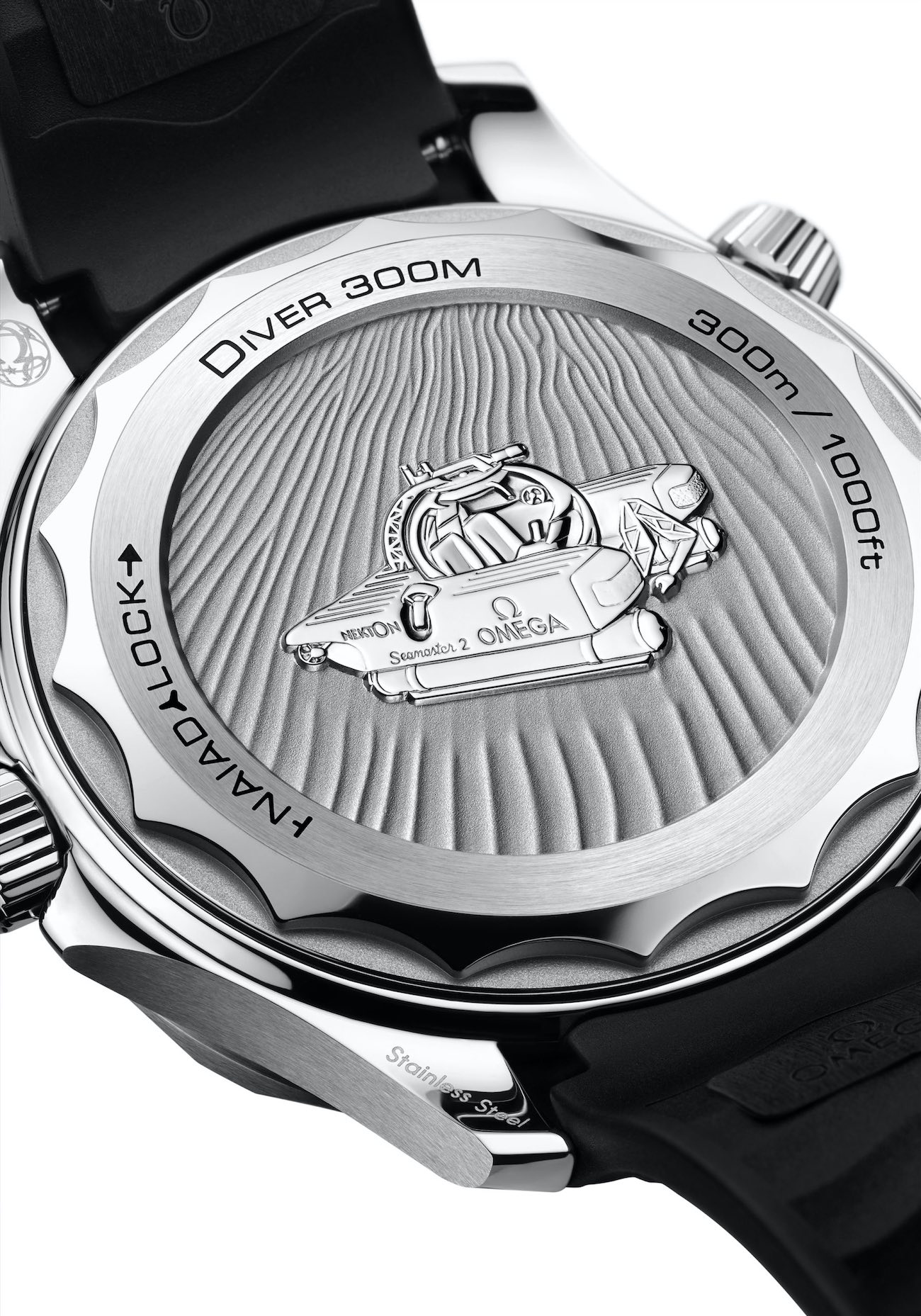 The caseback has also been prepped for the occasion and displays an embossed medallion of the Nekton diving submersible surrounded by a matte rippling pattern (depicting the sand you’ll find at the bottom of the sea). The 300m/1000ft water-resistance and the Naiad locking system that ensures that all the engravings on the caseback are oriented correctly are also shown on the caseback.
