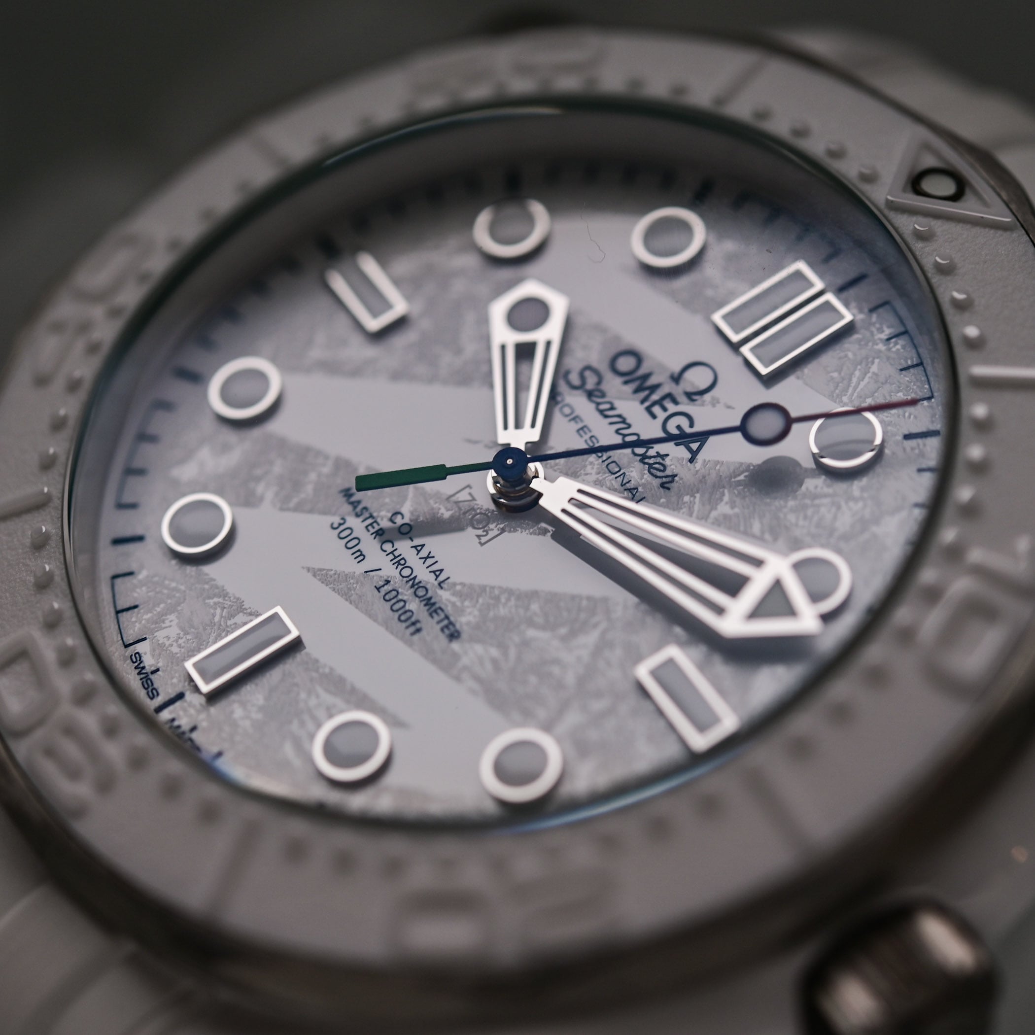 We’ll be talking details today, as this Paralympic Winter Games Milano Cortina 2026 version of the Omega Seamaster Diver 300M is, for 99% of its specifications, identical to the watch we’ve discovered earlier this year. For the most part, this Paralympic-themed model retains the same design and technical package, meaning a white ceramic edition of the Seamaster Diver 300M, itself based on the existing, and much darker, Seamaster Diver 300M Ceramic and Titanium. Here, to match the wintery theme, the watch is made mostly of white ceramic with several titanium accents – bezel, crown, escape valve.