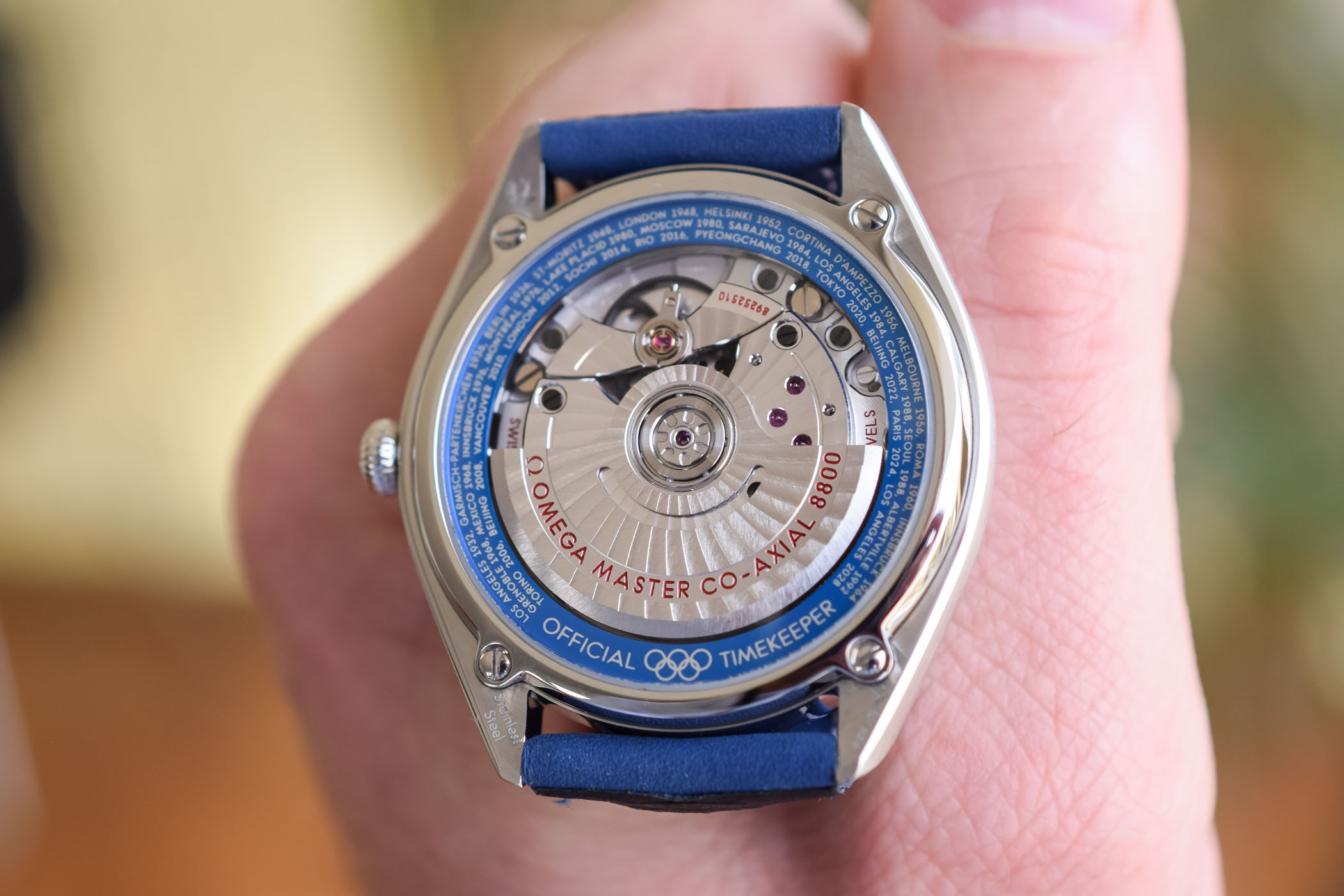 Inside the case is calibre 8800, an in-house movement with all Omega’s modern features: anti-magnetic; Master Chronometer certified; co-axial escapement; and a beefy 55-hour power reserve. The decoration is in the vein of Omega’s production with Arabesque Geneva stripes, blackened screws and bevelled bridges. The integration of the aluminium ring with the Olympic cities frames the huge movement that occupies the entire case.