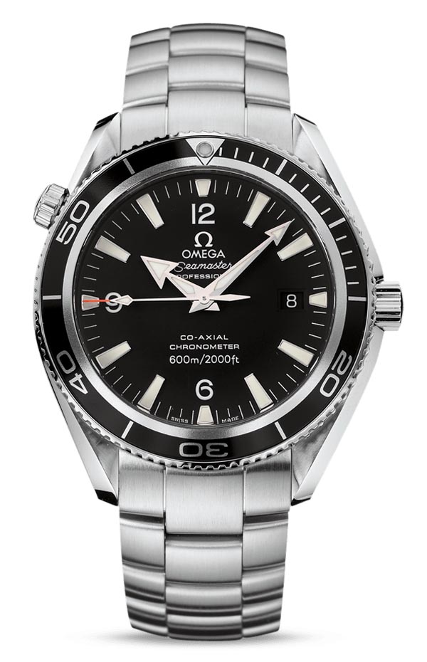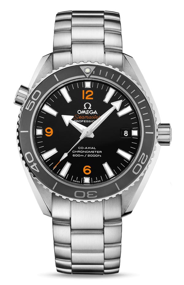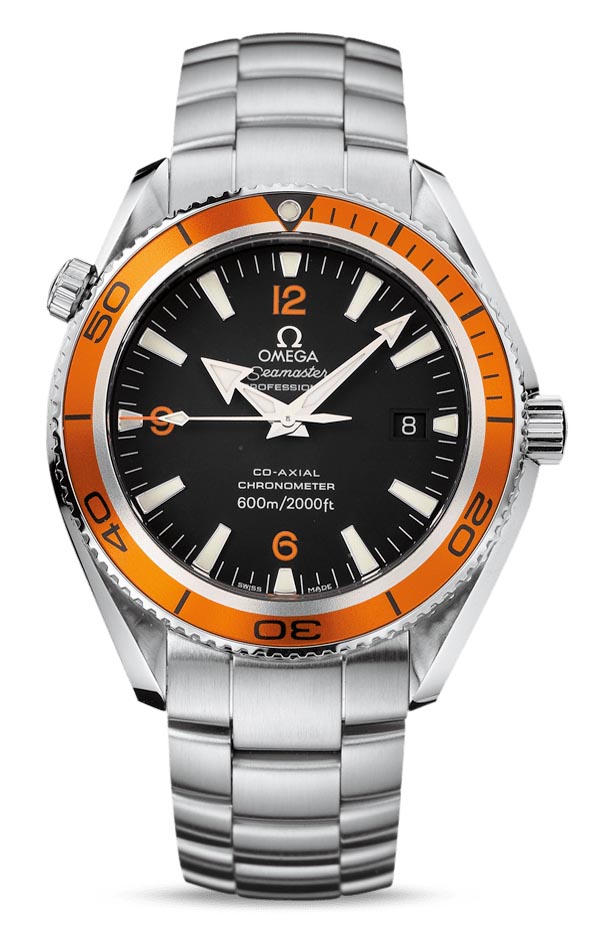 The Planet Ocean embraces the original 2005 style of this professional dive watch, with its hallmark orange bezel.