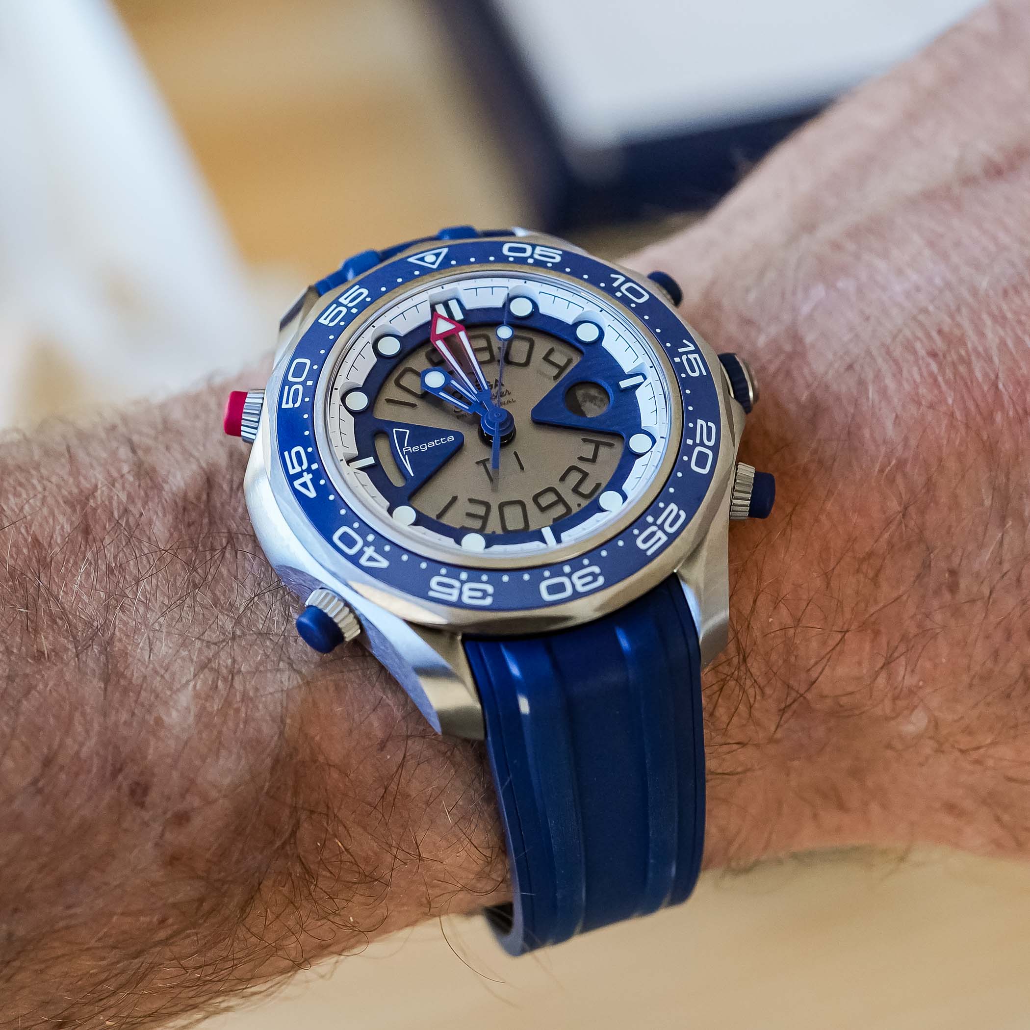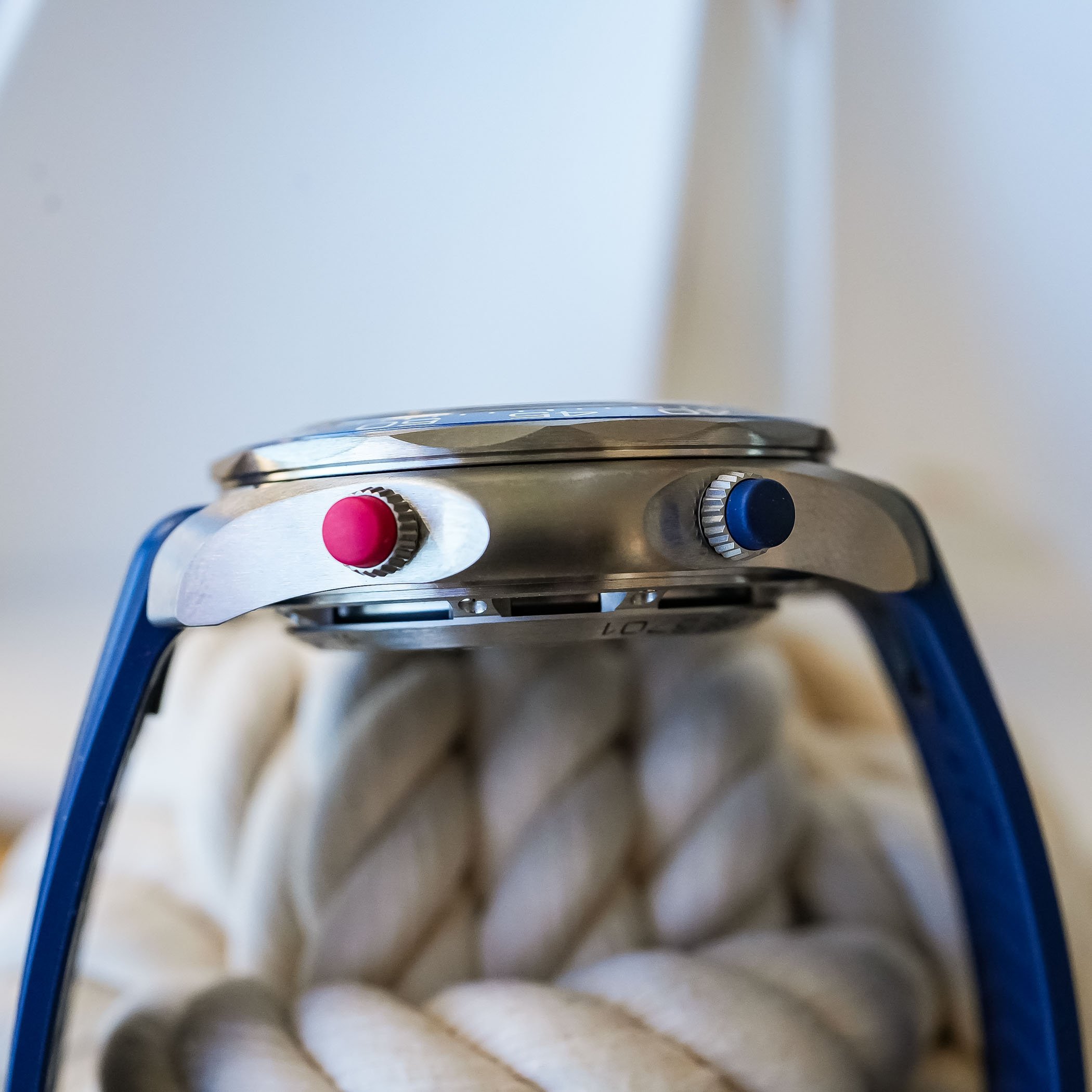 Despite being part of the X-33 family of instruments, the new Seamaster Regatta is first and foremost… a Seamaster. As such, its grade 5 titanium case has classic traits of Omega’s diving collection, with lyre-shaped lugs and a scalloped rotating bezel that’s inspired by the one used on the Seamaster Diver 300M. There are, however, strong differences with these classic automatic models, including fairly impressive proportions, with a 46.75mm diameter – it’s a striking watch, no doubt about that, yet it’s close to 2mm larger than a classic X-33 Skywalker (measured at 45mm). However, the length of the case remains pleasant at 48.5mm and titanium makes it light, with a total weight of about 90 grams. Like all models from this family of watches, it’s loaded with pushers (4 of them, all rubber-coated), which are colour-coded depending on their function – one in red and three in blue – and paired with a sandblasted crown with laser engraved ? logo. Water-resistance is rated at 50 metres.