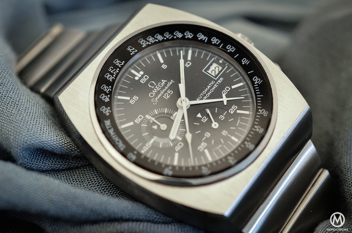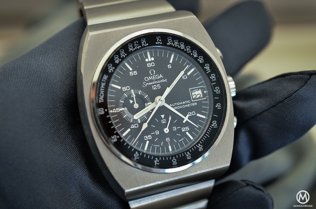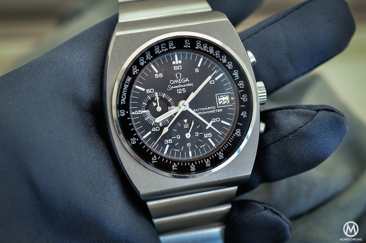 The Omega Speedmaster 125 relies on special construction too, as the case is made of two separate parts. The movement, dial, bezel and crystal are enclosed in a round inner case that fits into the chunky case itself and that is protected by an O-ring gasket. It creates an interchangeable module for the movement and dial. The Speedmaster Mark IV also shares that same construction, however in a tonneau-shaped case.