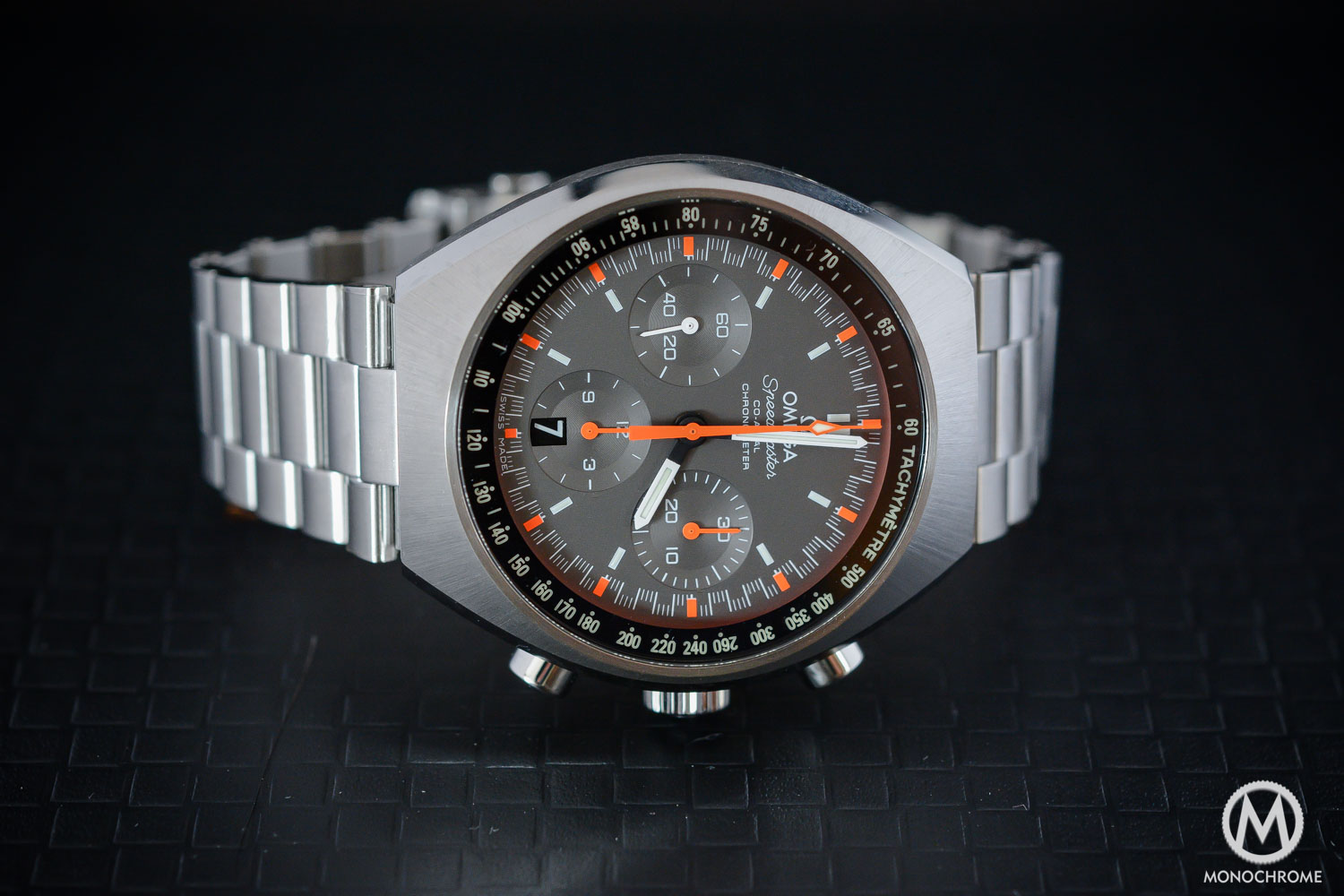 In order to absorb the Alaska Project R&D costs, in 1969 Omega introduced the first of the Speedmaster Mark Series, the Mark II ref. 145.014. The Mark II employed some of the specifications and innovations introduced in the Alaska Project, however with a more consumer-oriented approach – meaning that wearability was considered after all. The shape of the 45mm x 41mm case is seen nowadays as a typical 1970s style but the Mark II was one of the first watches to use that shape. It has this ‘egg’ style shape with integrated lugs and no apparent angles or facets. The tachymeter bezel would now be integrated but for the sake of legibility, it was not part of the dial but printed directly on the inner face of the crystal. The face of the watch was very similar to a ‘Moonwatch,’ with the same dial and hands. The only difference came from the inscription ‘Mark II’ under the ‘professional’ at 12. The Omega Speedmaster Mark II relied on the Calibre 861, the cam-operated variation of the historical Calibre 321. The Mark II 145.014 was also available in a funky ‘racing’ edition, with a dark grey dial, orange accents on the minute rail-track and orange hands for the chronograph indications. And this is the one that inspired the Omega Speedmaster Mark II Chronograph Co-Axial we have in our hands today.