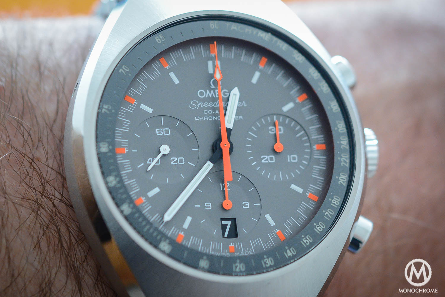For this modern edition of the Speedmaster Mark II, Omega decided to re-introduce the 2 vintage styles: a black dial with white hands and indexes (extremely close to an Omega Speedmaster Moonwatch) and a dark grey dial, with white main hands, white inscriptions and several orange accents (on the chronograph hands and on the 12 hour indexes), the so-called racing dial. if the dial is almost identical to the original ref. 145.014 (tri-compax layout, same places for the logos, same slightly recessed sub-dials, with the same function), one thing has to be noticed: a date window. Even if practical on daily-basis, it sometimes doesn’t make sense to add this function on a watch with a vintage-oriented feel. It would have more relevant (on an historical basis) and more elegant to simple remove the date function of the movement (this a personal opinion that some won’t share, seeing the date as an interesting feature).