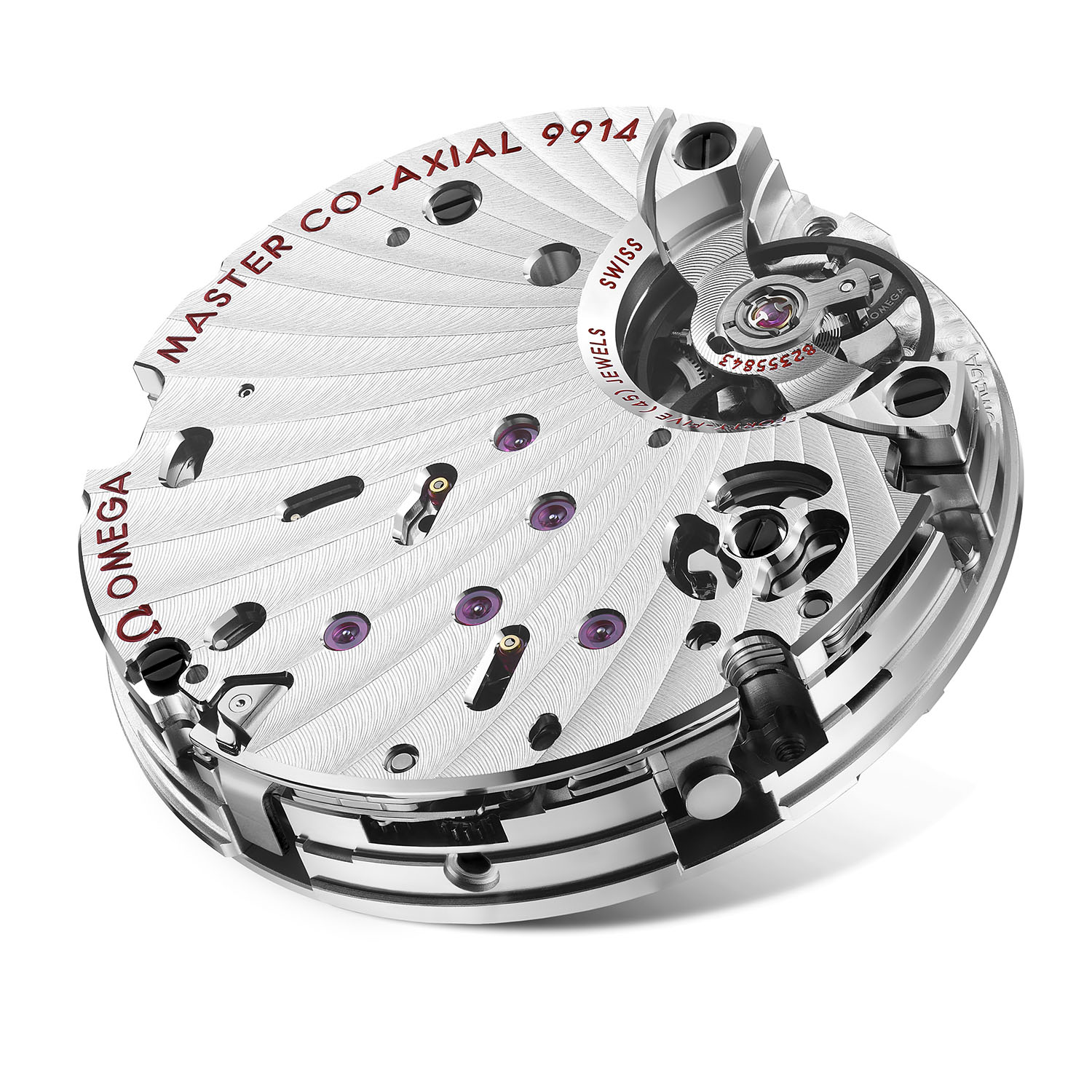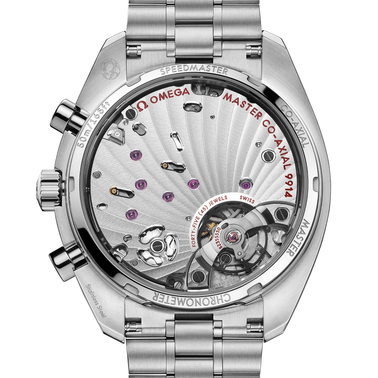 Inside the case is a new movement, the manual winding calibre 9914. It shares its technical base with the hand-wound calibre 9908 of the Speedmaster Chronoscope and the calibre 9900 of the Speedmaster 57, with identical 3/4 plate, and the same modern architecture with co-axial escapement, silicon balance, column wheel and vertical clutch. It runs at a 4Hz frequency, features two barrels in series for a comfortable 60h power reserve and being a Master Chronometer-certified movement, it is resistant to magnetic fields up to 15,000 Gauss. The main difference between this 9914 and the two aforementioned movements is located on the dial side with additional moon and date-by-hand complications.