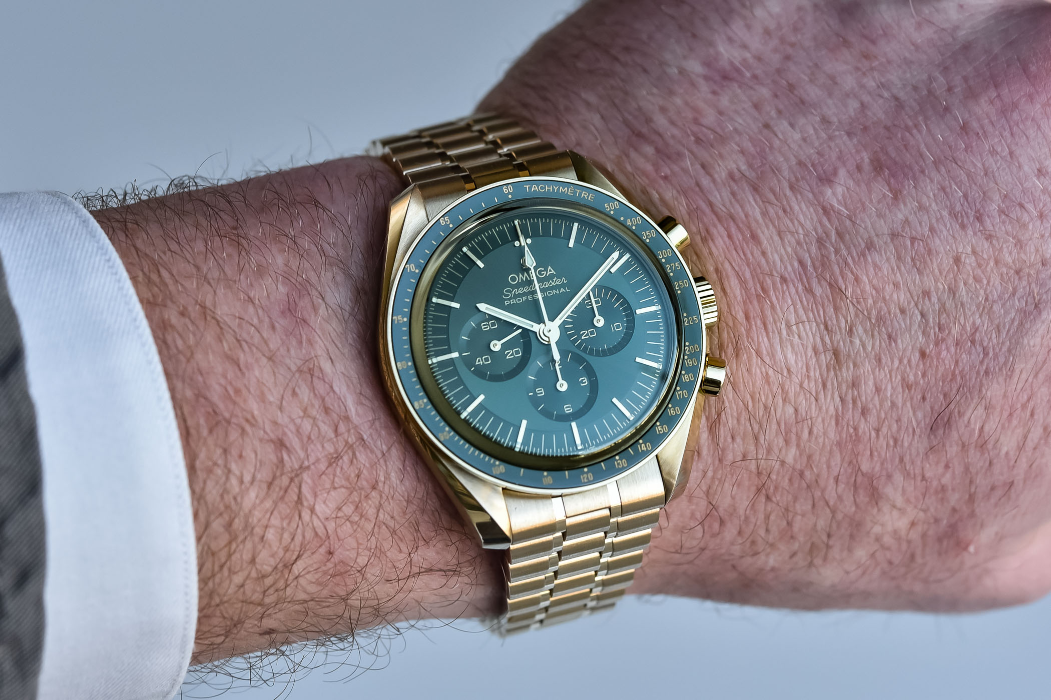 The classic Moonwatch by Omega is one of the most iconic and laureled chronograph watches in history. It is forever intertwined with the Apollo space missions, the moon landing and NASA. But since the 1970s, the Speedmaster has made it into a full-blown collection and remains one of the pillars for Omega. New for 2022 is the introduction of two 18k Moonshine gold models, one in deep green, and one with a black-and-gold Panda dial. Here are the two Omega Speedmaster Moonwatch Moonshine Gold.