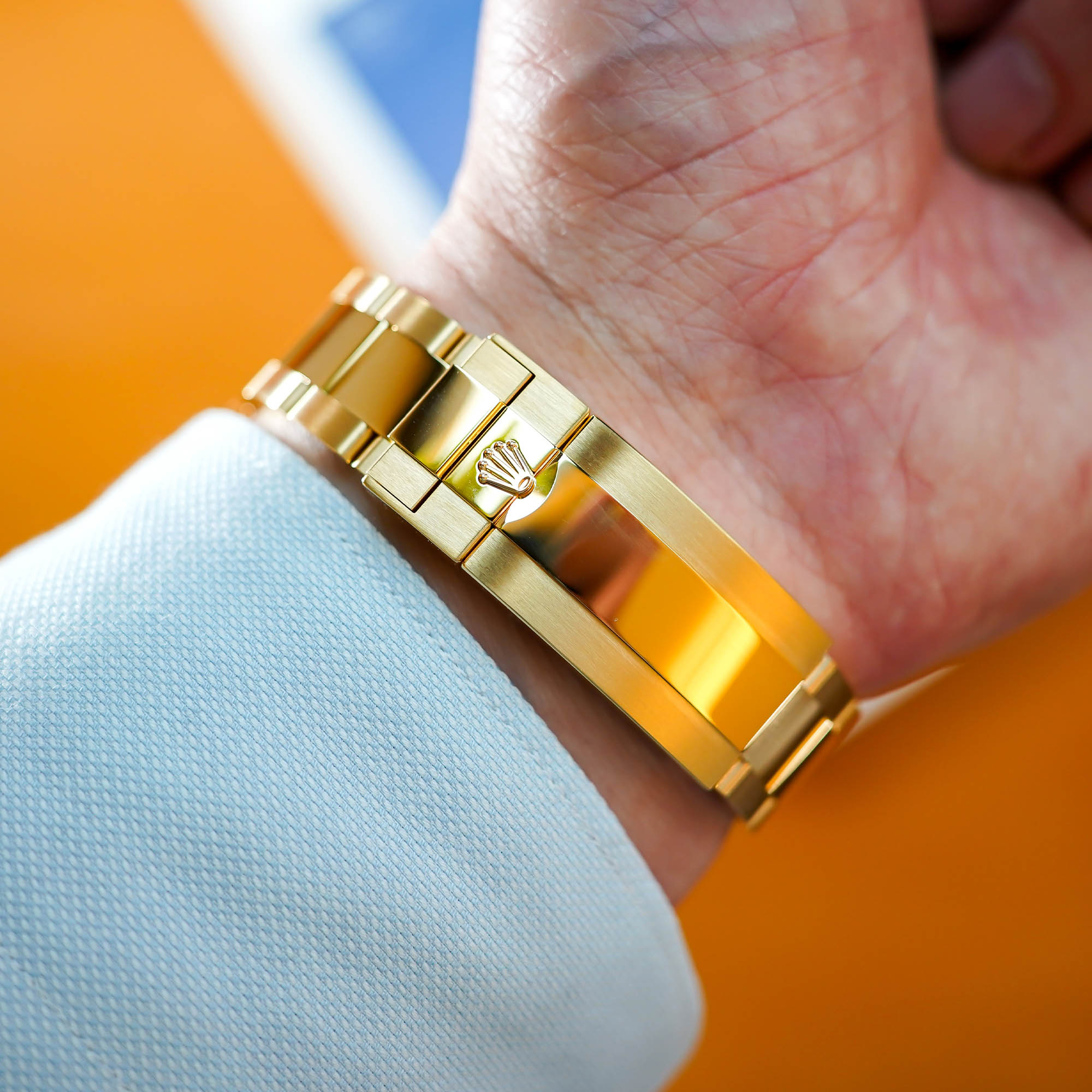 In all honesty, upon first handling the watch it became apparent to me that it made no sense whatsoever. For all the reasons I explained above, it simply shouldn’t work. And yet, it does…. in a weird way. A couple of weeks ago I had a bit more time with it in comparison to the mad dash that’s Watches & Wonders. And trying it on, it started to grow on me. In hand, it does indeed feel very heavy and you can’t ignore the sheer size. But on the wrist, it becomes quite balanced, both in size and weight. Granted, it helps that I have above-average-sized wrists at 19cm in circumference, but they’re not mammoth-sized either. Then there’s the weight, which the bracelet helps to distribute quite evenly, much to my surprise. It’s not overly top-heavy, nor is it uncomfortable to the point you simply can’t wear it. Far from it in fact, the fit and finish of the gold case and bracelet, the titanium caseback, and the Glidelock extension system are typical Rolex. Or in other words; extremely good!