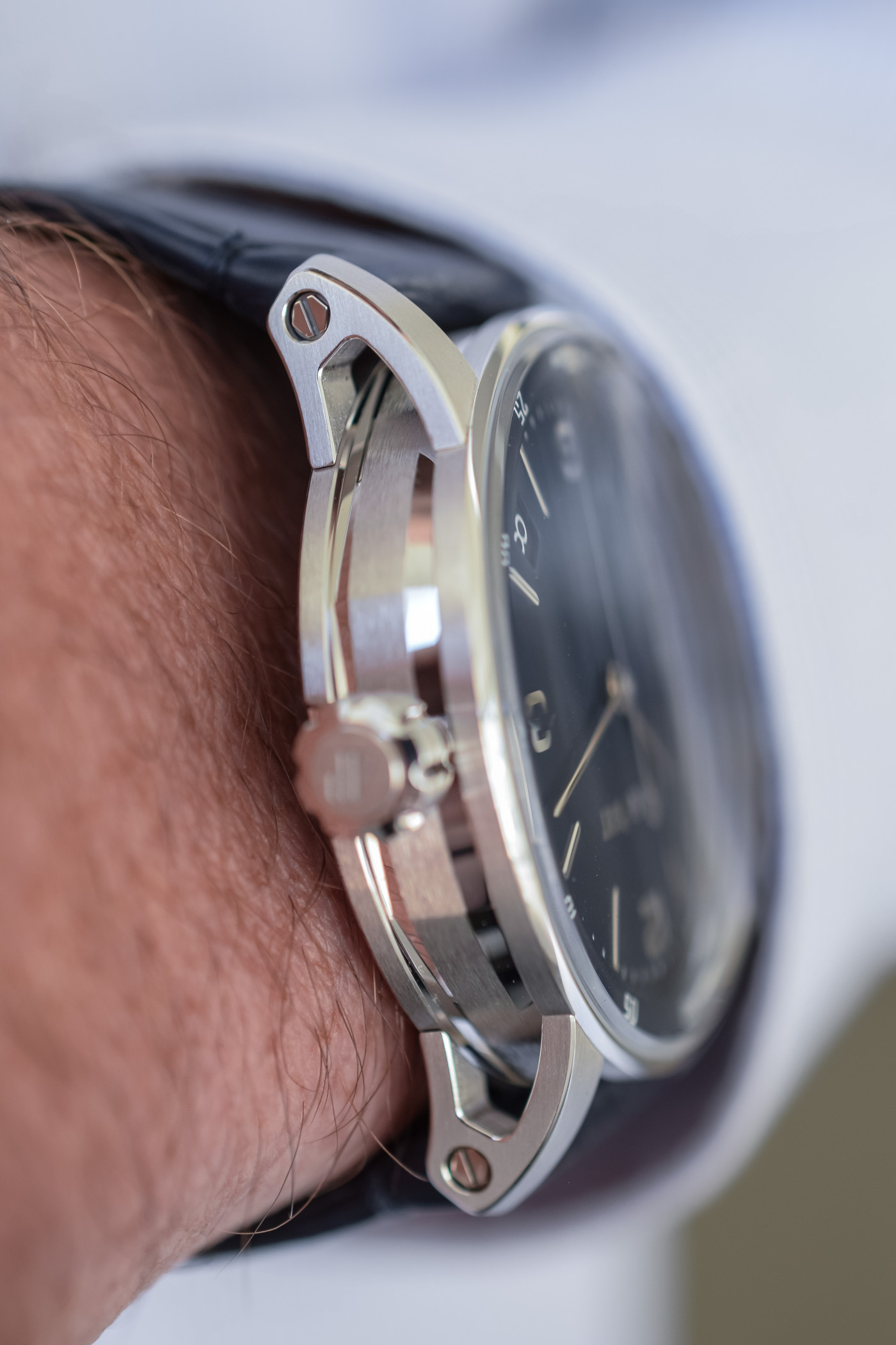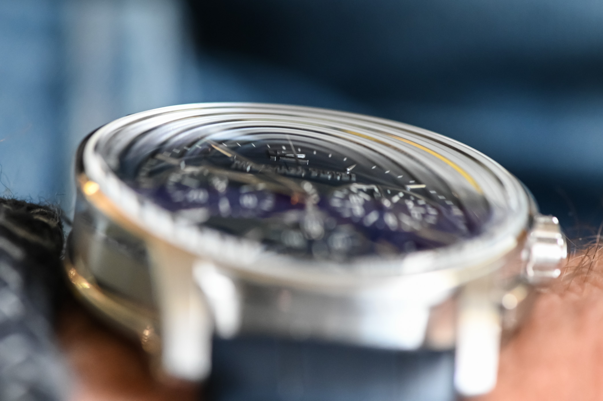 The original handset was lame: boring skinny stick hands. The newer half-skeletonized baton hands are better, but still not my favorite. The case is complex and robotic, and the original dial was sparse and midcentury which was a strange mismatch. The newer dials with the dense ripple pattern make me dizzy, and I’m still not sure that they match the style of the case.