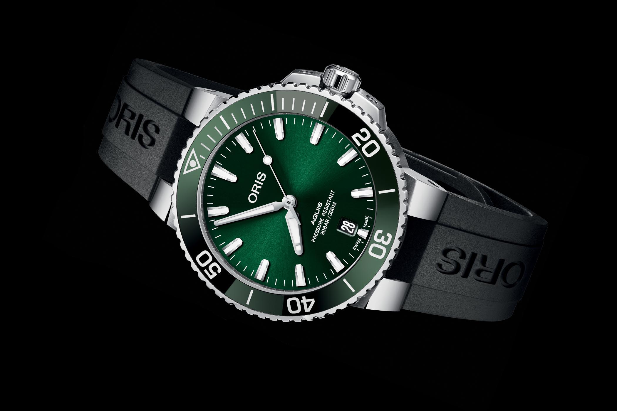 The Oris Aquis Date 39.5mm with Green Dial will be available as of February 2019, at a price of EUR 1,650 (leather or rubber) or EUR 1,850 (steel bracelet). More details at oris.ch.