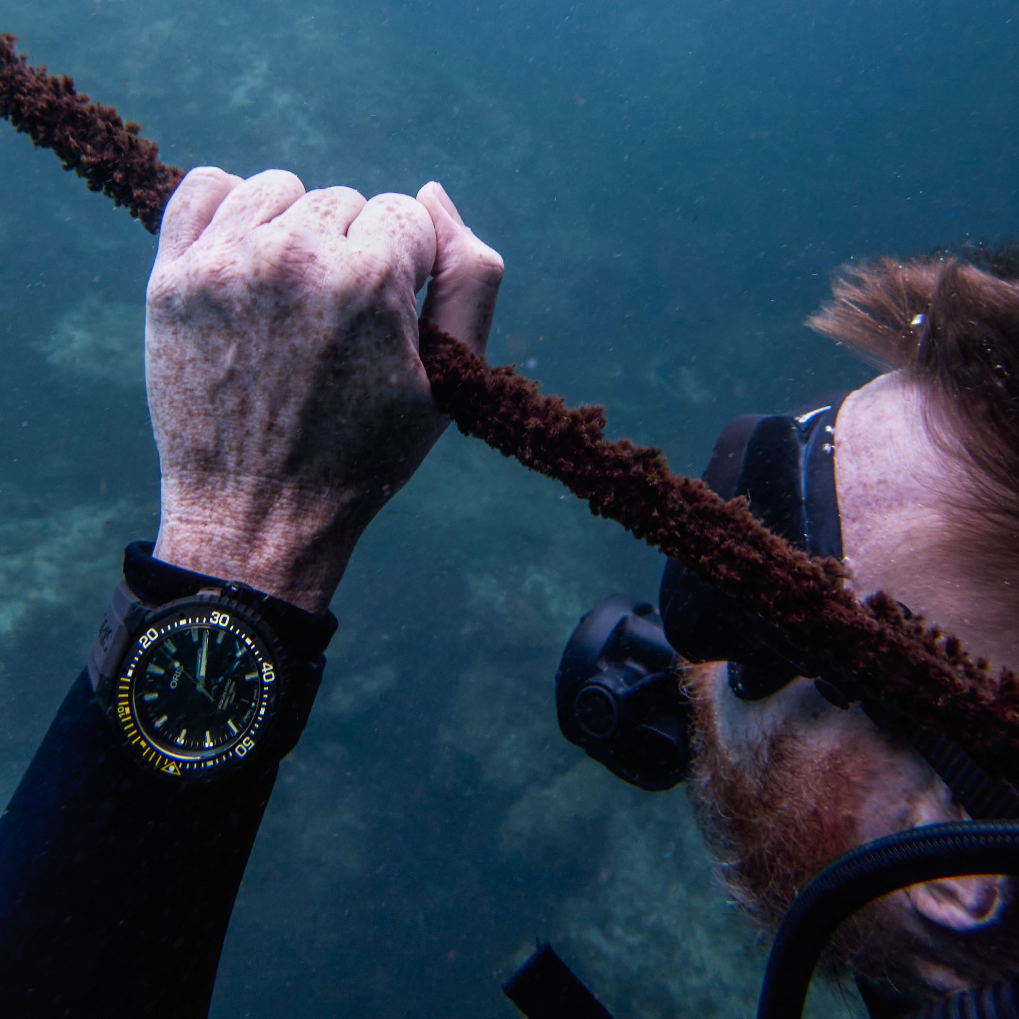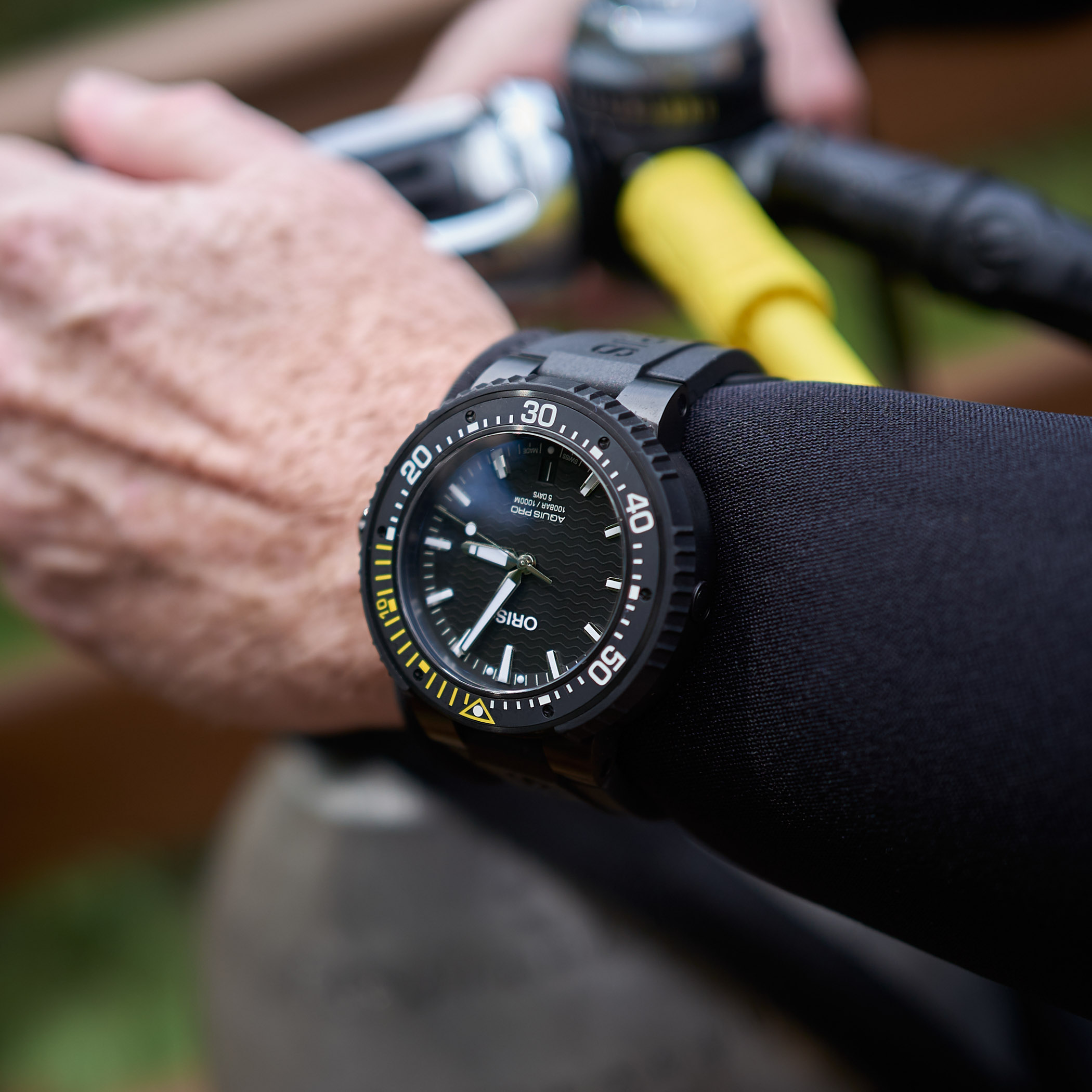 Let’s talk about the bezel for a moment. It features Oris’s patented Rotation Safety System, known as RSS. In practice, the bezel is fully locked and unable to rotate in either direction, until you pull the grippy locking mechanism that surrounds the bezel up towards you, away from the wrist. There is a sturdy click and just like that the bezel is unlocked, and free to easily rotate counter-clockwise to set the timing function. Once set where you want it, you simply push the whole mechanism back down toward your wrist and the click locks it back into place, unable to be turned, ensuring the safe timing of the dive. As one who has been fortunate enough to dive with many a dive watch over the last few years, this Oris now sits at the top of my list of favourite bezels to use. Many brands have tried many things over the years to provide locks to the bezel to keep divers from accidentally mistiming a dive, from the simple and functional, to the unnecessary and confounding, but this is the first one that I have ever found completely intuitive and seamlessly simple to use. The lock feels like it’s just part of the act of setting the bezel, rather than an annoyance to be dealt with afterwards. The outer ring is just grippy enough to be easily operated with either gloved or bare hands, and once unlocked the bezel has just the right amount of resistance to be easily turned to precisely where you want. I don’t rave about a bezel very often, but this one is just about perfect.