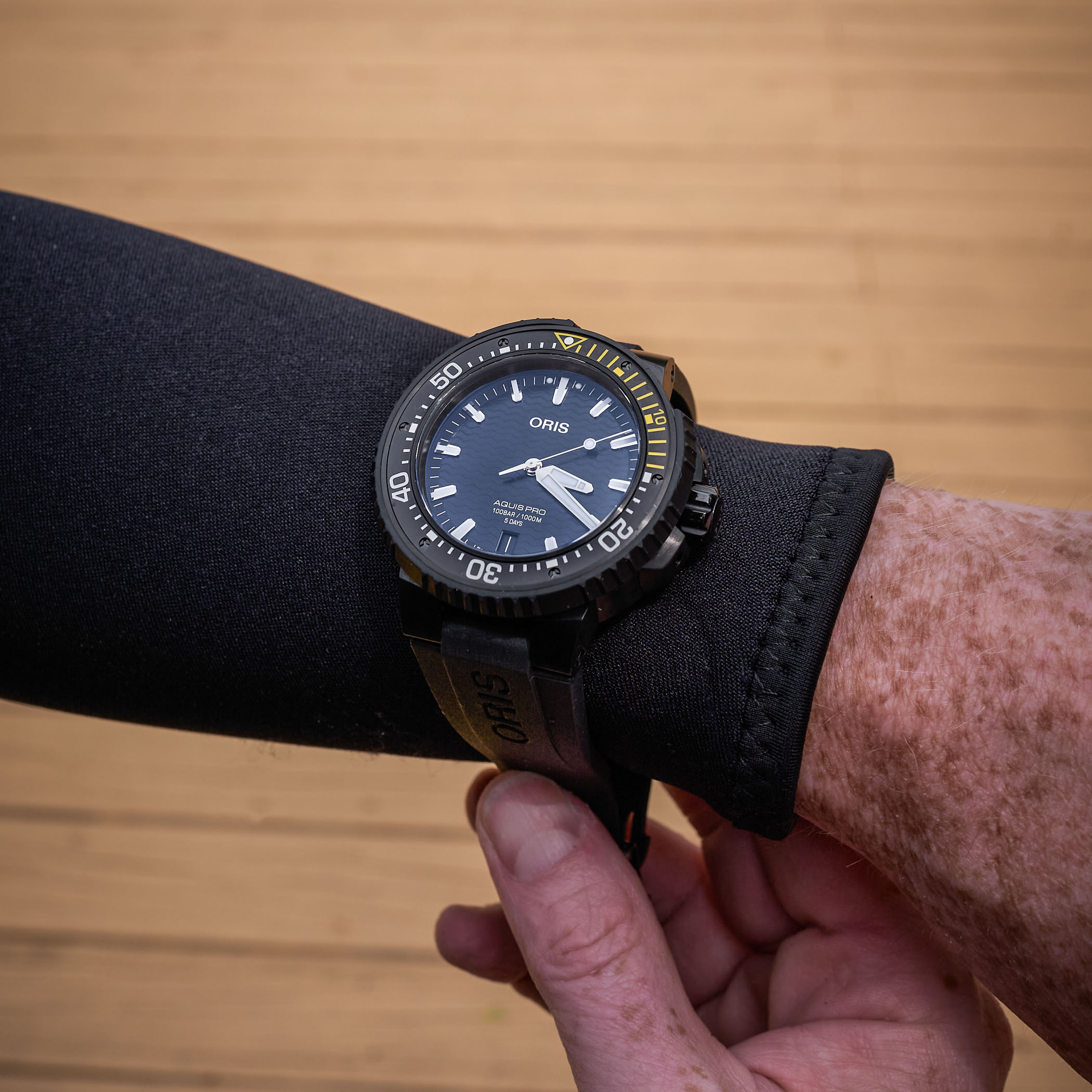 It’s well known that very few divers are diving with a wristwatch as their sole timing device these days. I can personally recall meeting only one in all my time diving. Being relegated to a backup timing device might take some of the pressure off of the mechanical watch, but you wouldn’t know it from wearing the Oris AquisPro. This thing is one serious piece of dive gear. We took it diving in a natural spring and cavern down in Florida to put it through its real-world paces. Strapping it onto my non-computer wrist, I was struck by how much the watch blends into the modern dive kit. Its monochrome colour scheme looks right at home with most wetsuits, drysuits and buoyancy compensators. With the extra padding of the wetsuit it fits perfectly and hugs the wrist like a glove. No edges or discomfort of any sort.