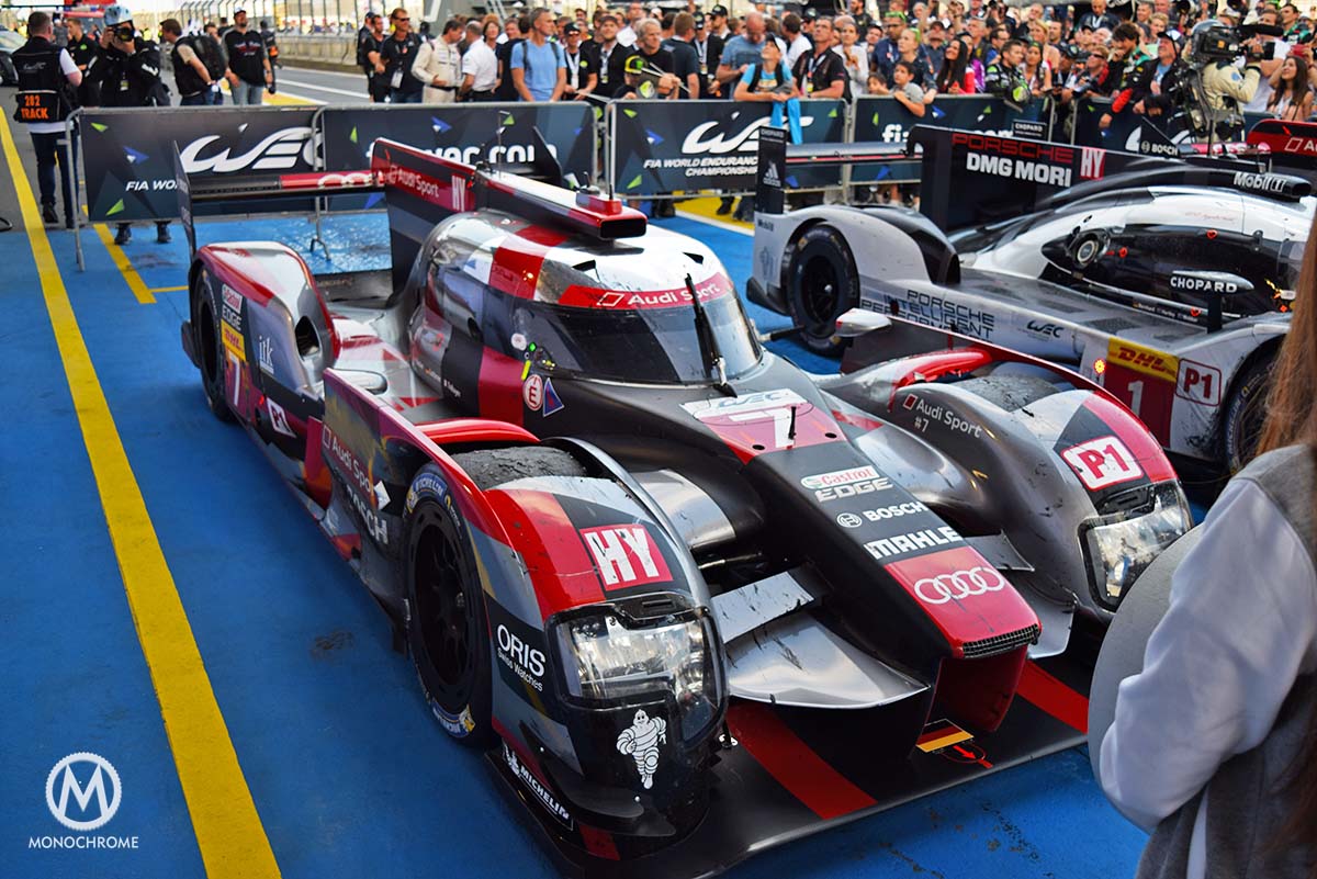 A typical racing weekend in the FIA WEC class features a number of training runs on Friday and Saturday, qualifying on Saturday and of course a race on Sunday. The only exception being the Le Mans 24-hour race, which starts on a Saturday and runs for a full 24 hours. To be honest, qualifying is a bit of a formality since a LOT can happen in 6 hours of racing and even more in 24 hours. It is also entertaining to see that none of the competitors take it easy, in order to just endure the 6 hours. It is a full-on race, almost as if it lasts only 6 laps and there is a BIG prize to be collected at the finish (of course there is, but you get the idea right?). Swapping places left and right, the occasional light touching through turns as a Porsche wiggles its way past the Audi or the other way around, a fair number of pit stops and, a crash here and there and eventually the entire race comes down to less than a minute! After 6 hours, 194 laps and 1000km of racing the gap is less than 60 seconds! Sadly for Audi, they lost out to Porsche but achieved a P2 and P3 in the final results.