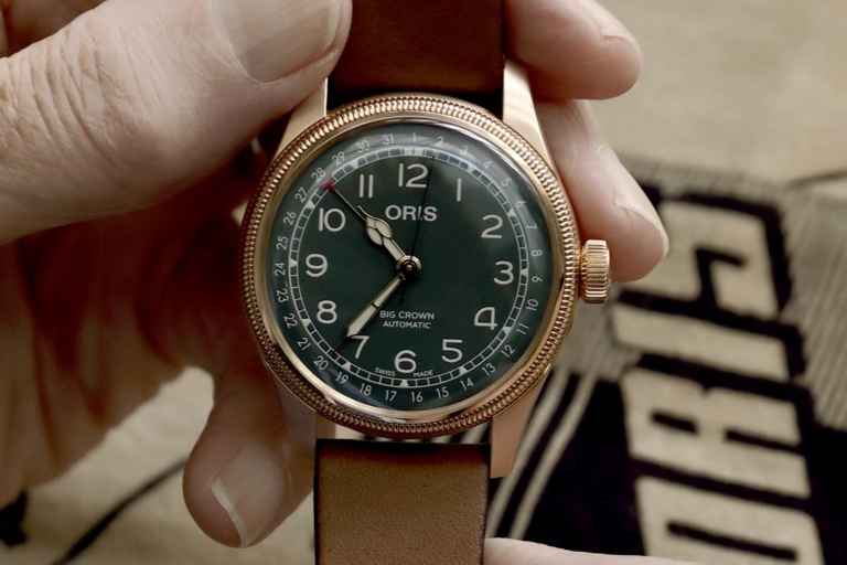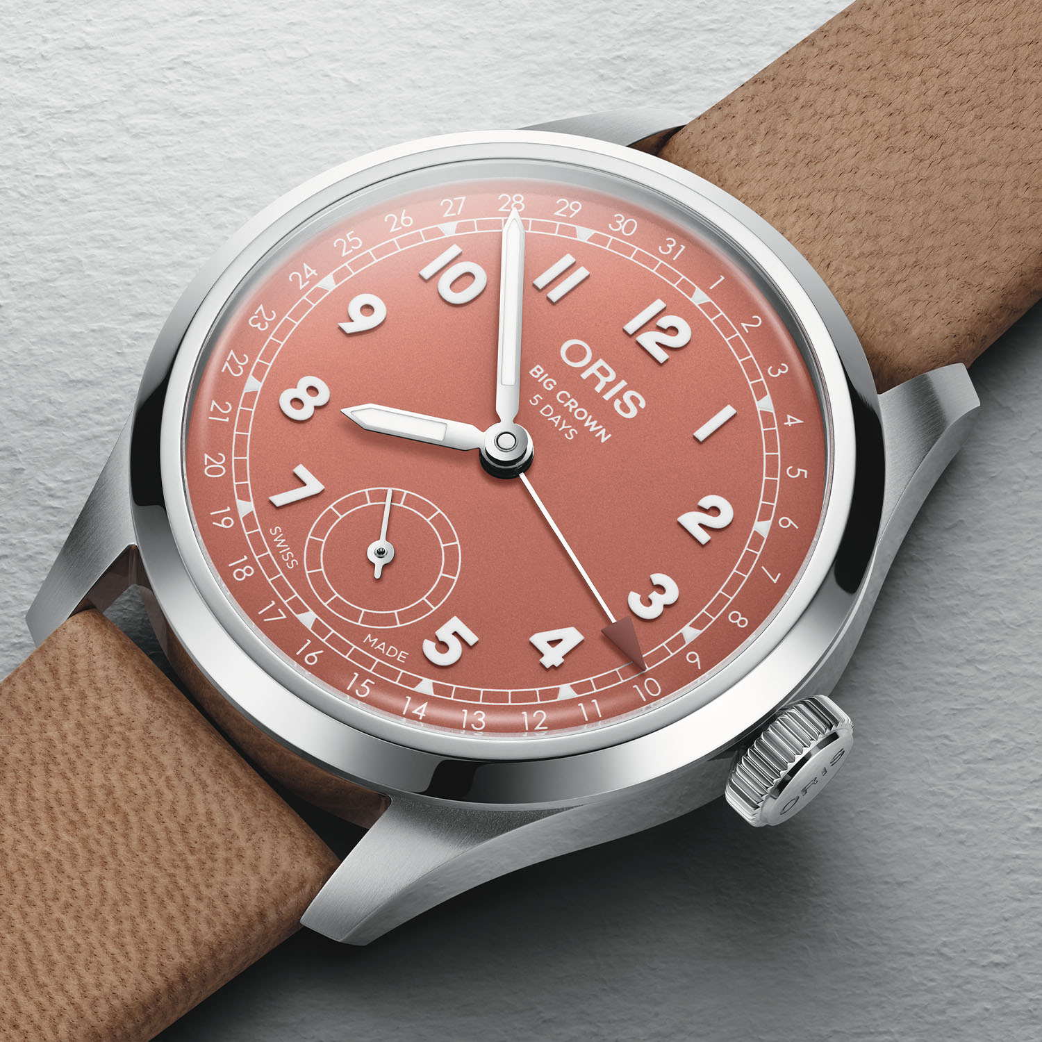 The Big Crown Pointer Date, an important piece in the history of Oris since 1938, has lived through various iterations over the years, evolving with the times to introduce changes and improvements but always faithful to the spirit of the original. In 2021, Oris introduced a 38mm Big Crown Pointer Date model powered by calibre 403, an in-house developed automatic movement with solid resistance to magnetism, five-day power reserve and a ten-year warranty. The diameter was a departure from the 40mm standard. Also gone was the classic coin-edged bezel, which was replaced with a flat polished bezel. This year, Oris brings characteristics and elements of the 2021 design to the primary collection, with two watches featuring earthy dial colours.