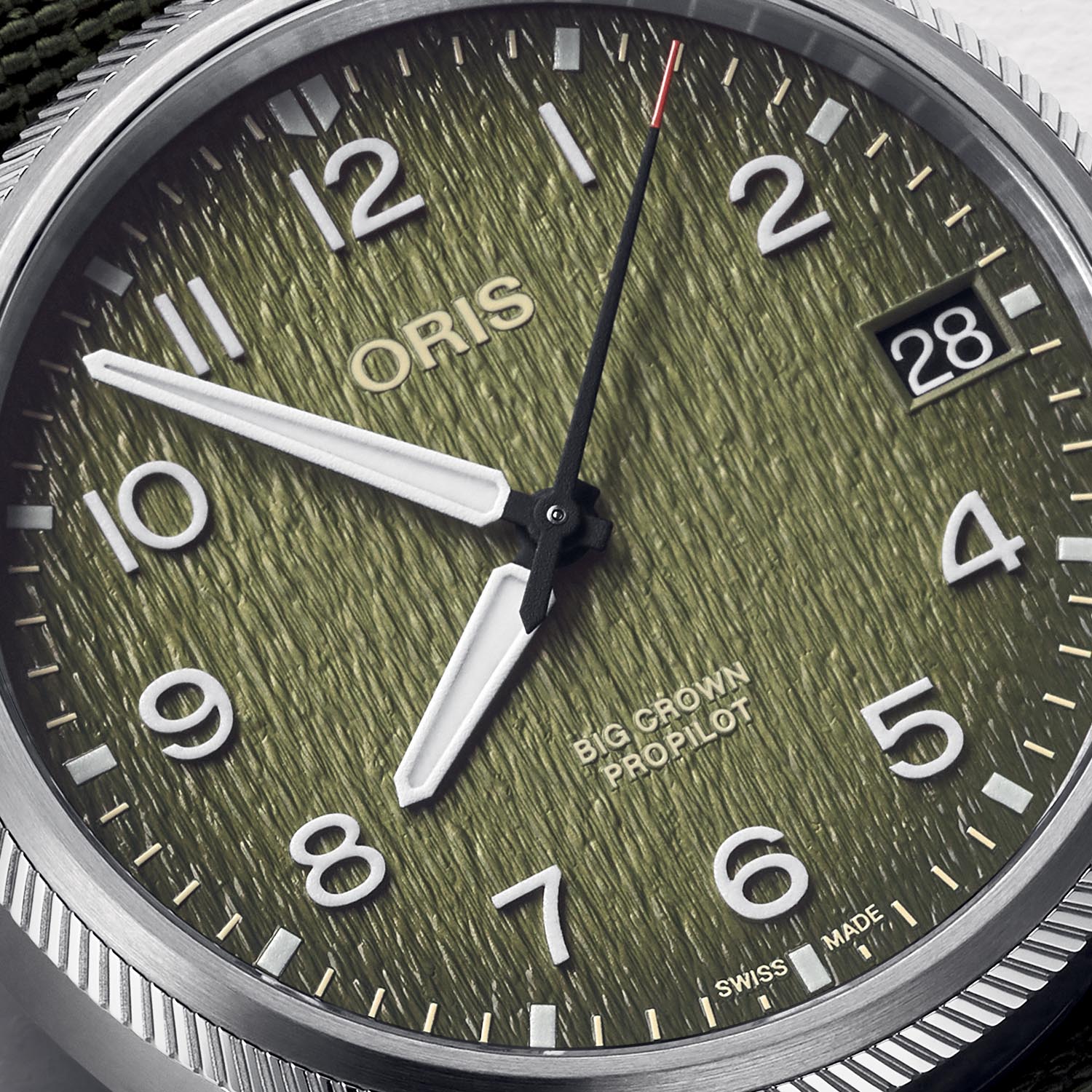 The pièce de résistance is, without a doubt, the dial specifically created for this Okavango Air Rescue Limited Edition. Contrary to standard models with simple dials focused only on legibility, this version of the Oris Big Crown ProPilot comes with a green dial with a texture that recalls the grasses of the Okavango Delta. Certainly polarising, it also separates this LE from the rest of the collection and gives it personality. For the rest, classic elements are still present, such as the applied and luminous Arabic numerals, the white-painted luminous hands and the date window sits at 3 o’clock.