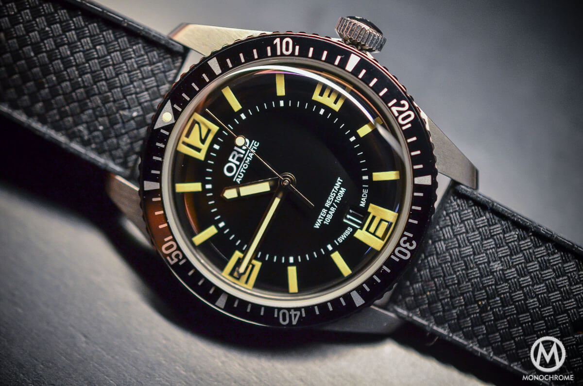 Oris teams have done a complete job with this dial, case, strap, markers and crystal. They even improved the watch a bit by displaying the date more discreetly – it is printed on a black disc in a small window at 6. The final hammer blow: the retail price of 1.600 Euros. Note that it is also available with a fabric NATO strap. More details on Oris.ch.