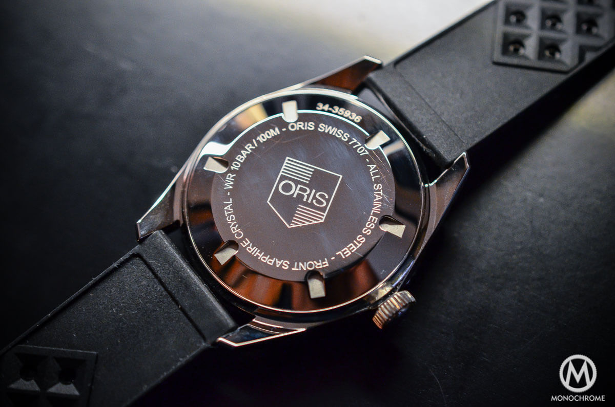 As said, concessions to modernity exist. The size and materials are of course different. The case now measure 40mm instead of 36mm for the vintage edition – a size that remains however reasonable. It uses modern stainless steel (something common nowadays, but do not forget that the vintage one, like many other watches from this era, was made from chromium-plated brass). The look however is extremely similar and Oris even brings back the domed crystal, this time made in sapphire and not in Plexiglas – a really qualitative choice considering the high price of such domed sapphire crystals – and a very good-looking one too.