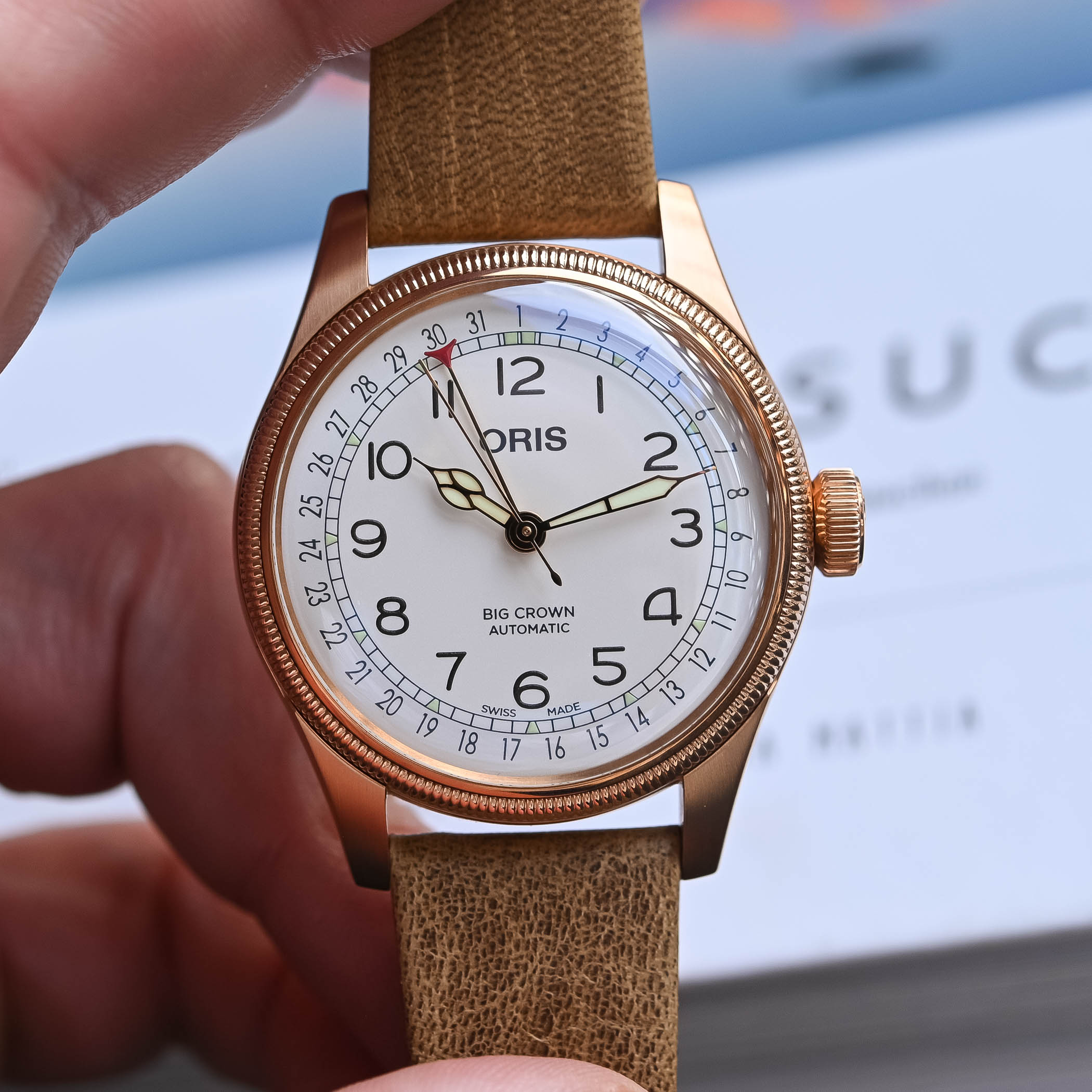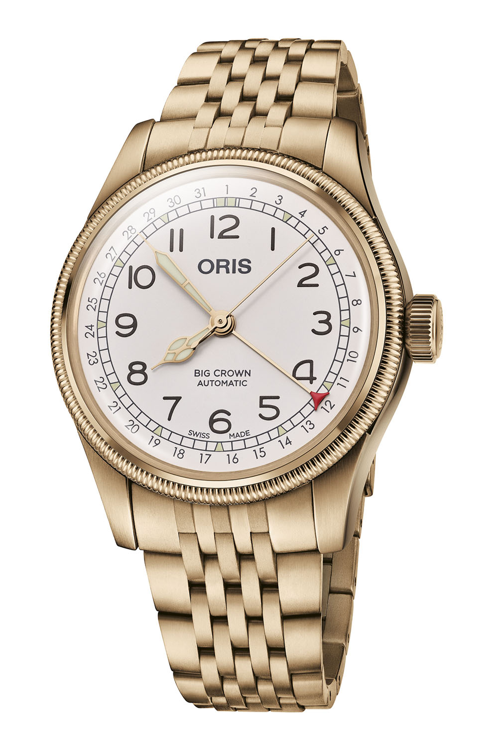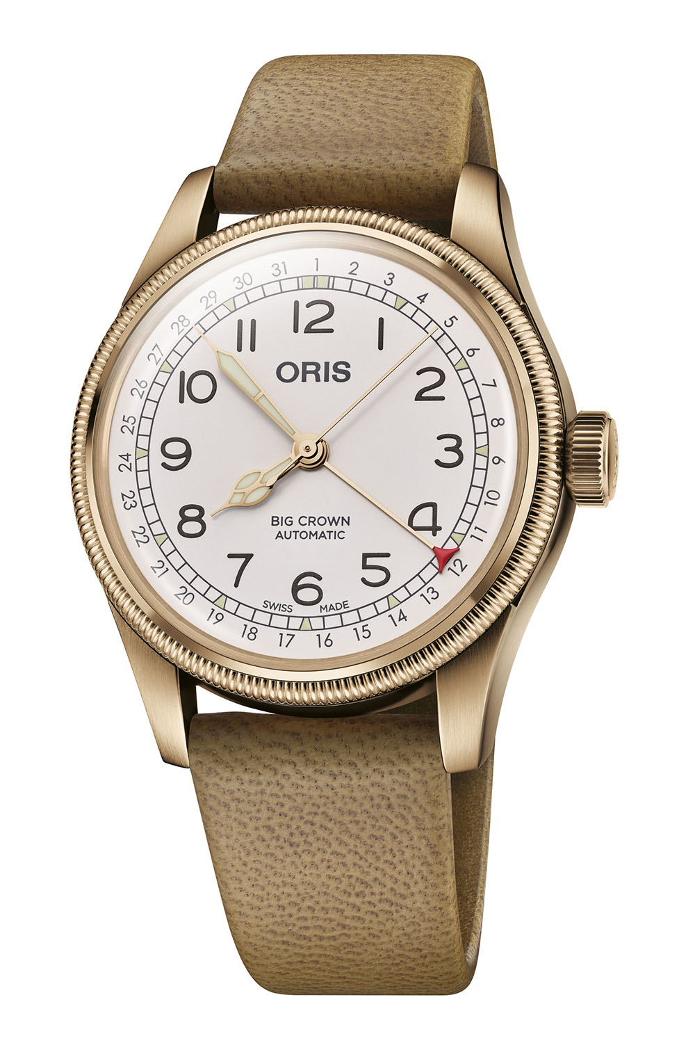 The dial is white with the date track on the periphery, indicated by the red crescent-tipped central hand, a layout patented by A. Hammerly in 1915 before date windows became popular. The use of stylised typography for the large Arabic numerals and cathedral-style hands are textbook old-school pilot watch. For enhanced legibility, the numerals, the light green indices on the minutes track and the hour and minute hands are treated with beige Super-LumiNova.