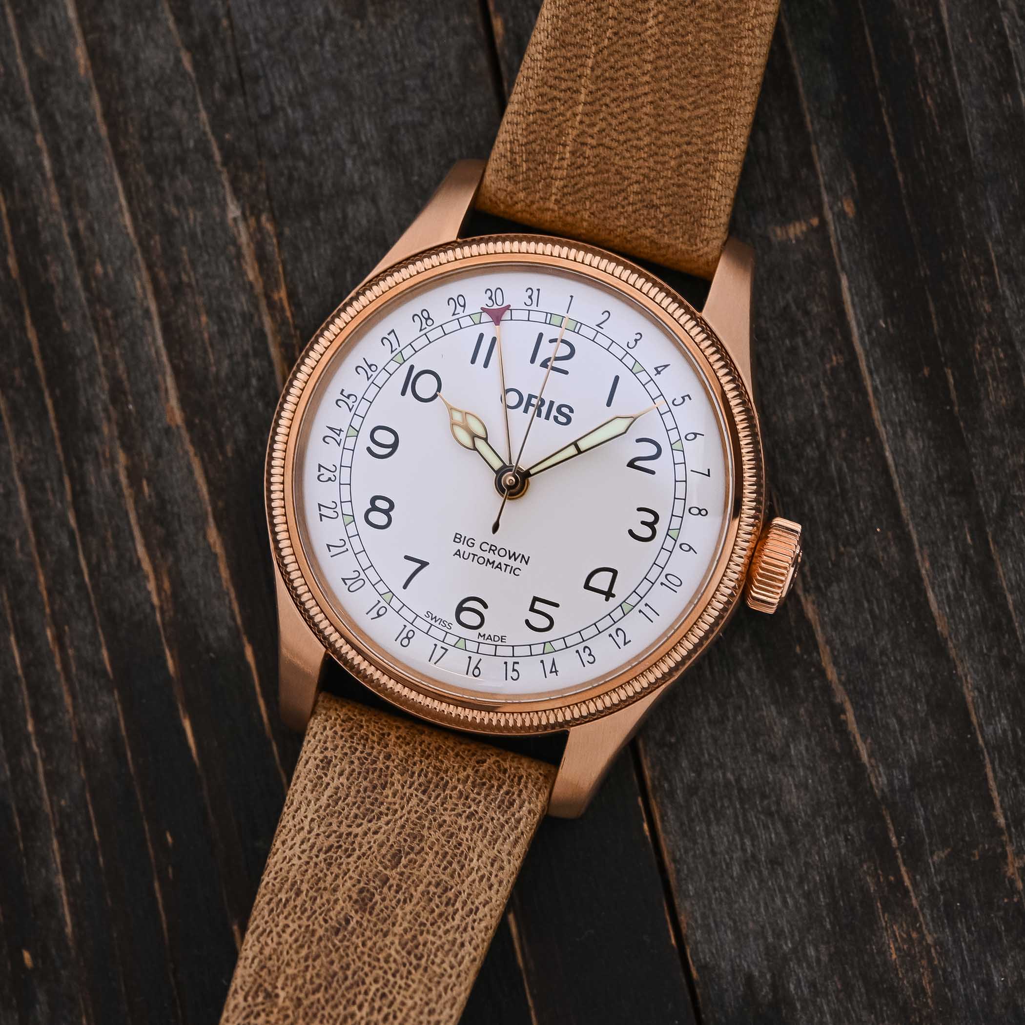 Released in 1938, the Big Crown Pointer Date was initially designed for pilots and characterised by its oversized crown, allowing pilots to manipulate it without having to remove their gloves, and its red-tipped pointer hand indicating the date. But it is also iconic in the brand’s history because it was the mechanical model that kept Oris afloat during the quartz crisis. Oris introduced a bronze version of its Big Crown Pointer Date in 2019, a material that underscores the watch’s attractive vintage aura. Appearing again in 2022 with an impressive full bronze bracelet, the new Father Time model is also presented with a bronze bracelet and an additional brown leather strap made from deer leather.