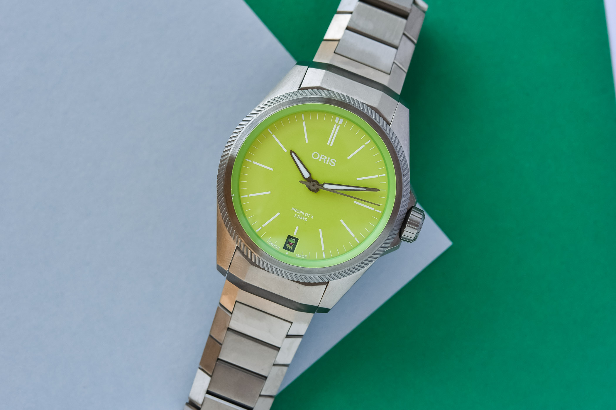 The not-so-serious part is not even the dial colour, lime green. The very light pink salmon dial from the launch of the ProPilot X Calibre 400 last year already indicated that Oris is not shy to use the brighter end of the colours book. The date window on the first of every month will show you a happy, smiling image of Kermit the Frog, the beloved character that has made generations laugh for many years. Oris ProPilot X Kermit Edition is the first reference to mark the collaboration between Oris and the Muppets. Remarkably, the creative team decided to celebrate Kermit in such a subtle way. There is a TV advertisement for Oris with the talented amphibian, made in Hollywood, where Kermit sings his own “Gotta Make Time for Me” while playing his banjo. You have got to see that, too.