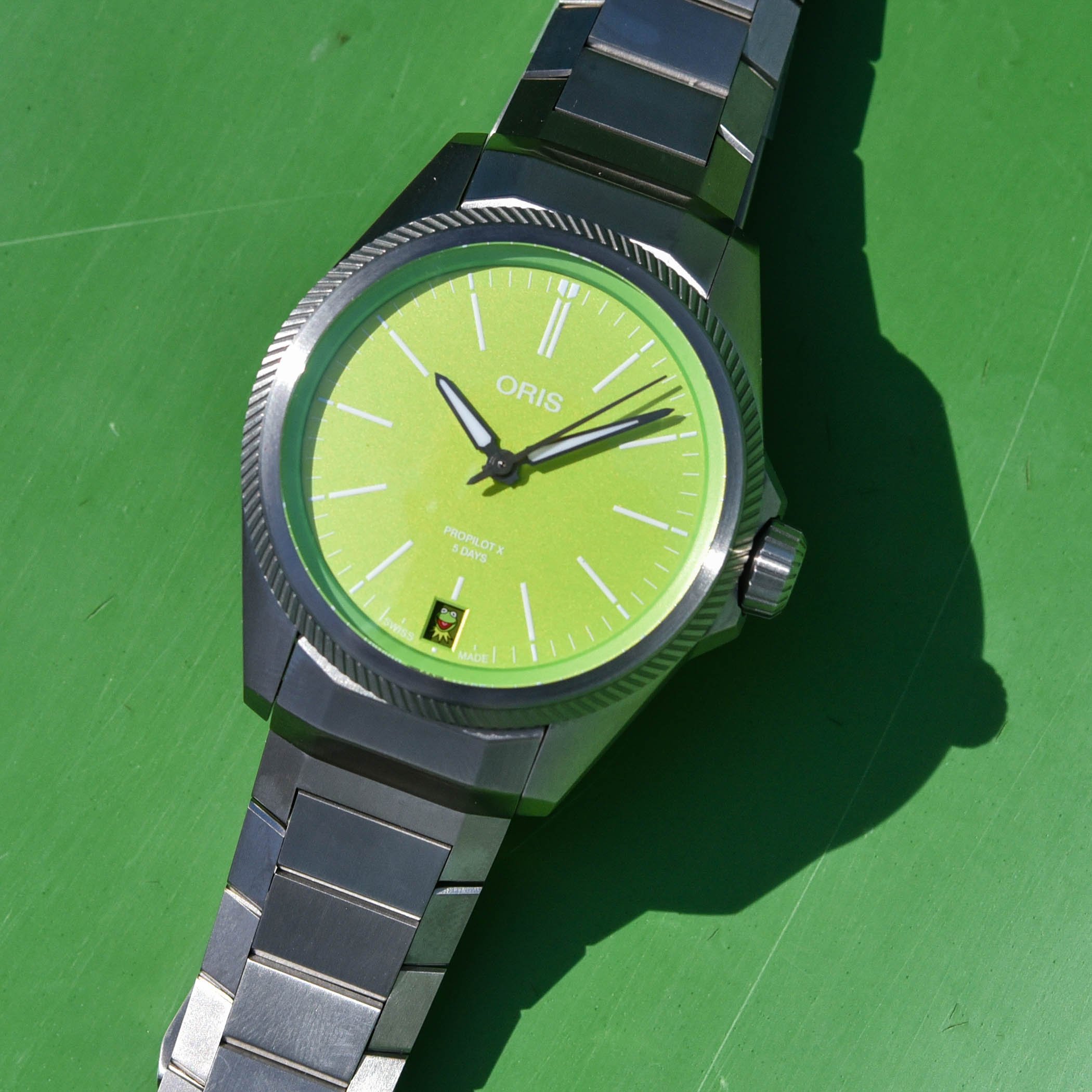 The not-so-serious part is not even the dial colour, lime green. The very light pink salmon dial from the launch of the ProPilot X Calibre 400 last year already indicated that Oris is not shy to use the brighter end of the colours book. The date window on the first of every month will show you a happy, smiling image of Kermit the Frog, the beloved character that has made generations laugh for many years. Oris ProPilot X Kermit Edition is the first reference to mark the collaboration between Oris and the Muppets. Remarkably, the creative team decided to celebrate Kermit in such a subtle way. There is a TV advertisement for Oris with the talented amphibian, made in Hollywood, where Kermit sings his own “Gotta Make Time for Me” while playing his banjo. You have got to see that, too.