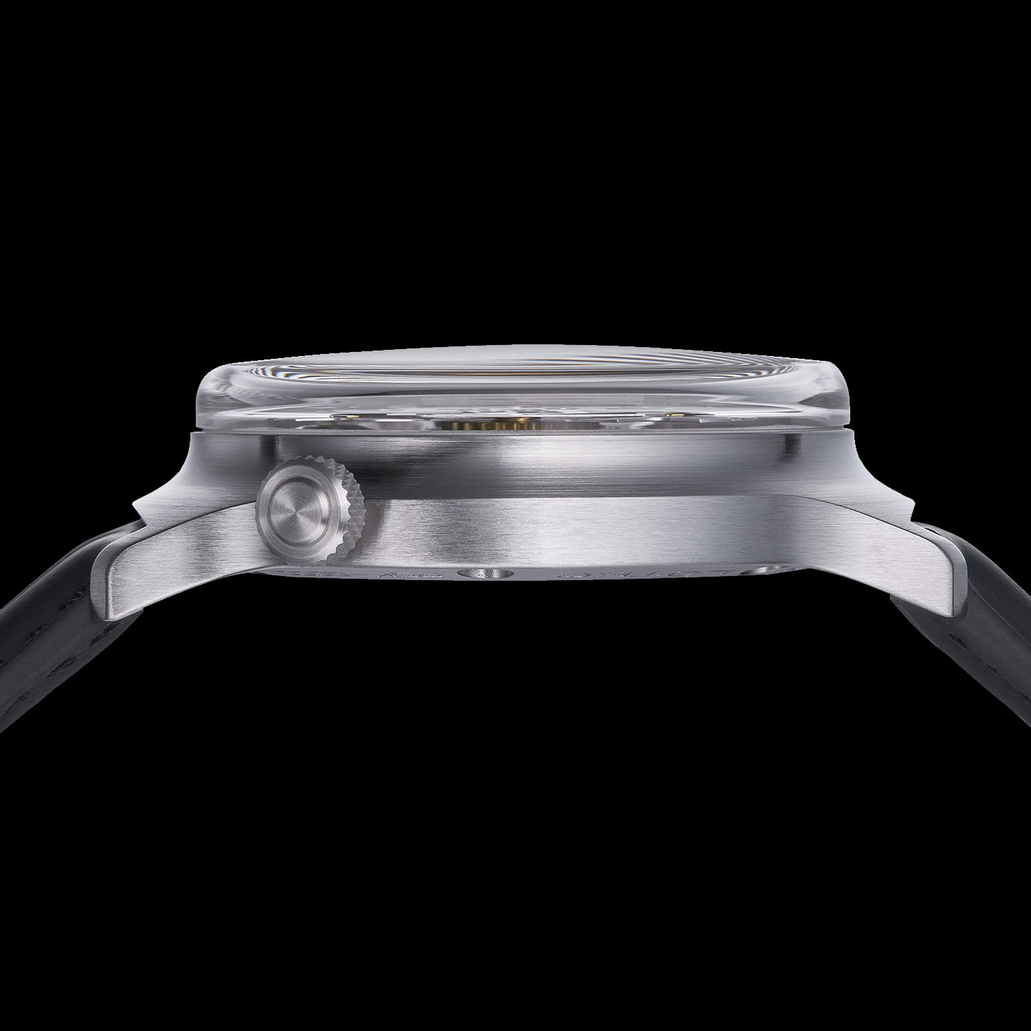 Power comes from a classic Japan-made Miyota 90S5, an automatic movement with 25 jewels, a 4Hz frequency and about 40 hours of power reserve. It is used to provide power to the in-house module on top. The watch is worn on a double-padded black leather strap, closed by a pin buckle.