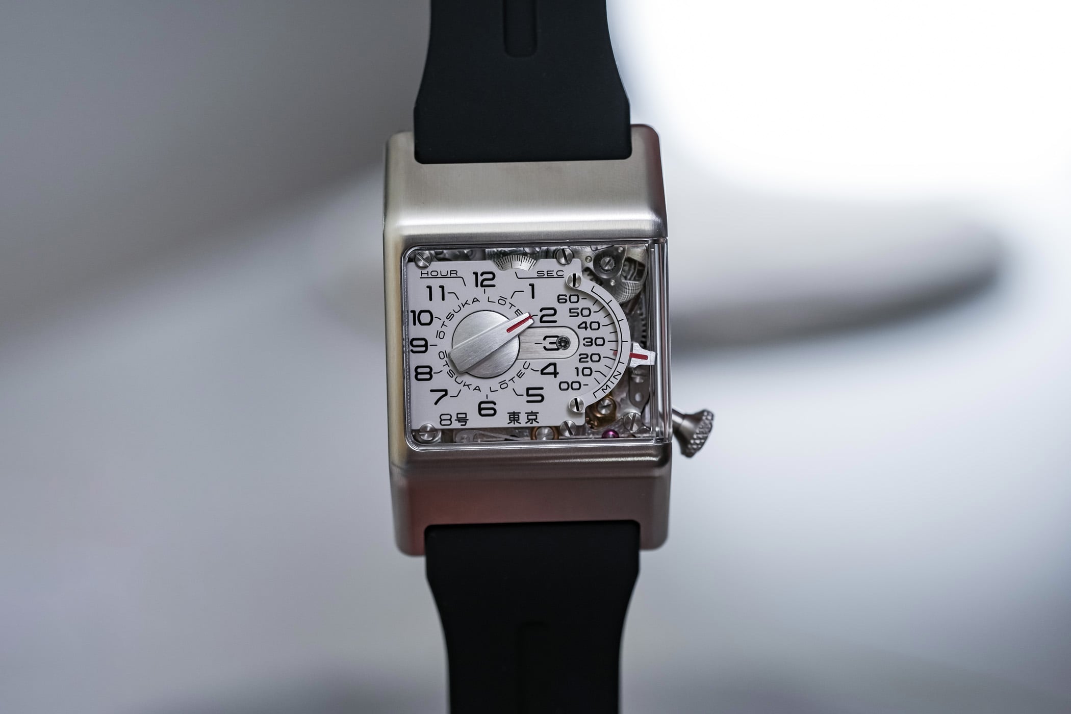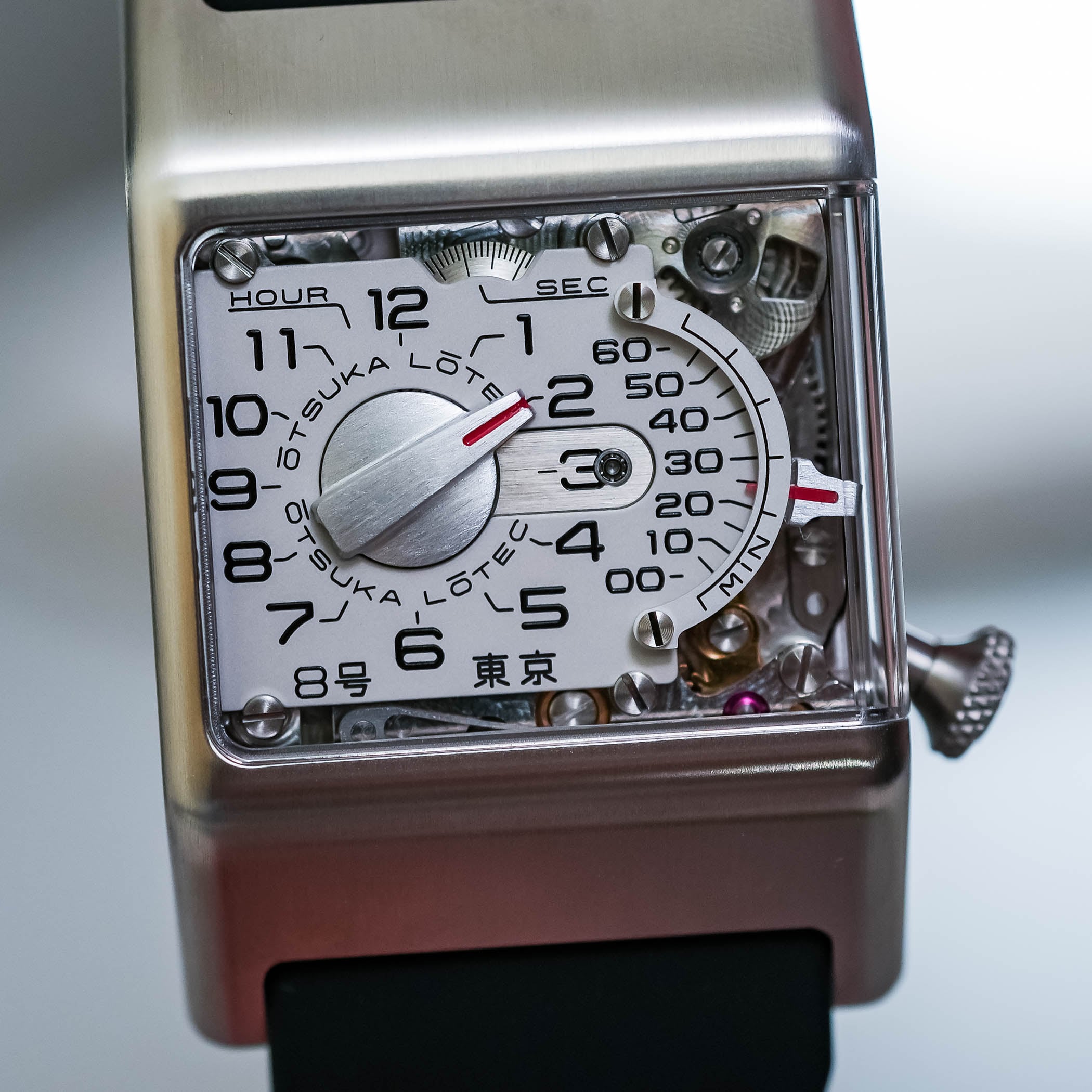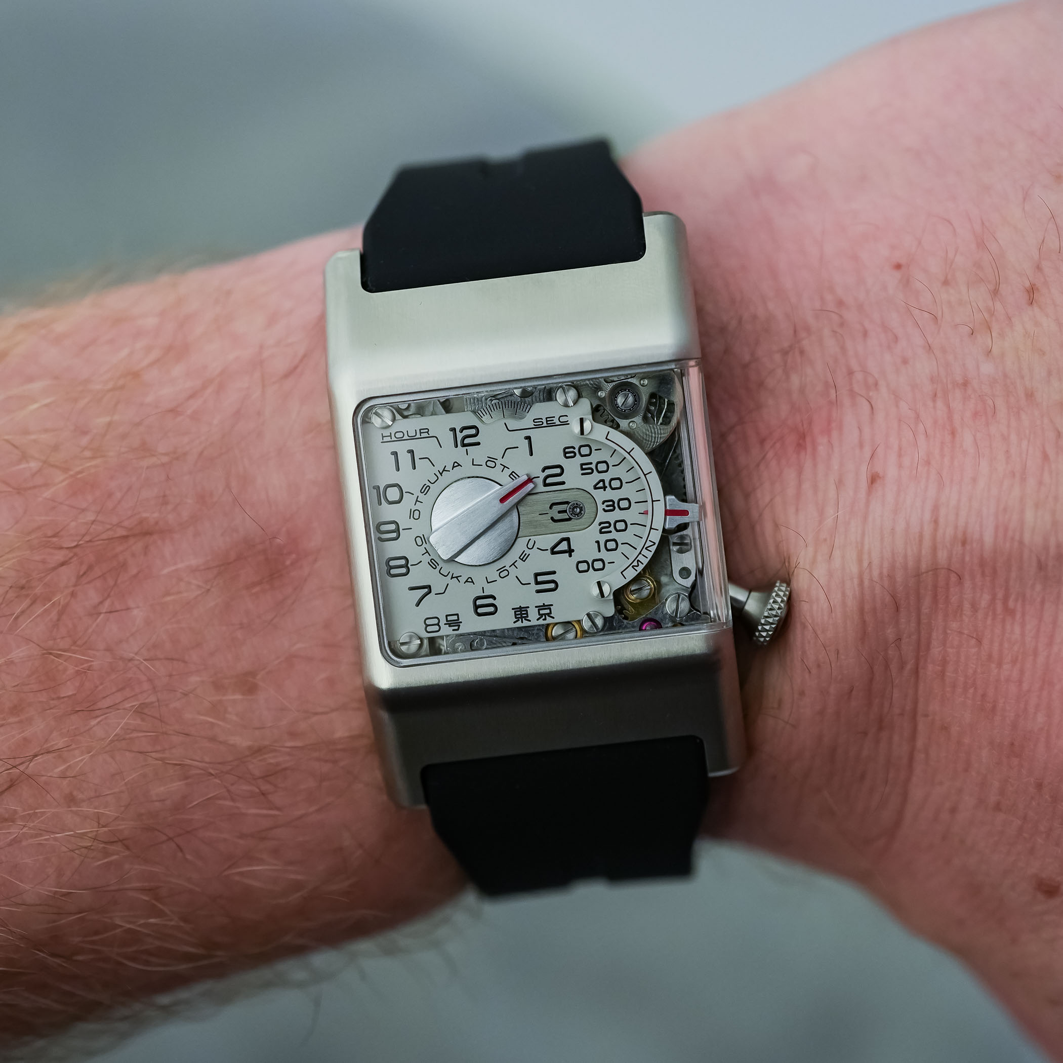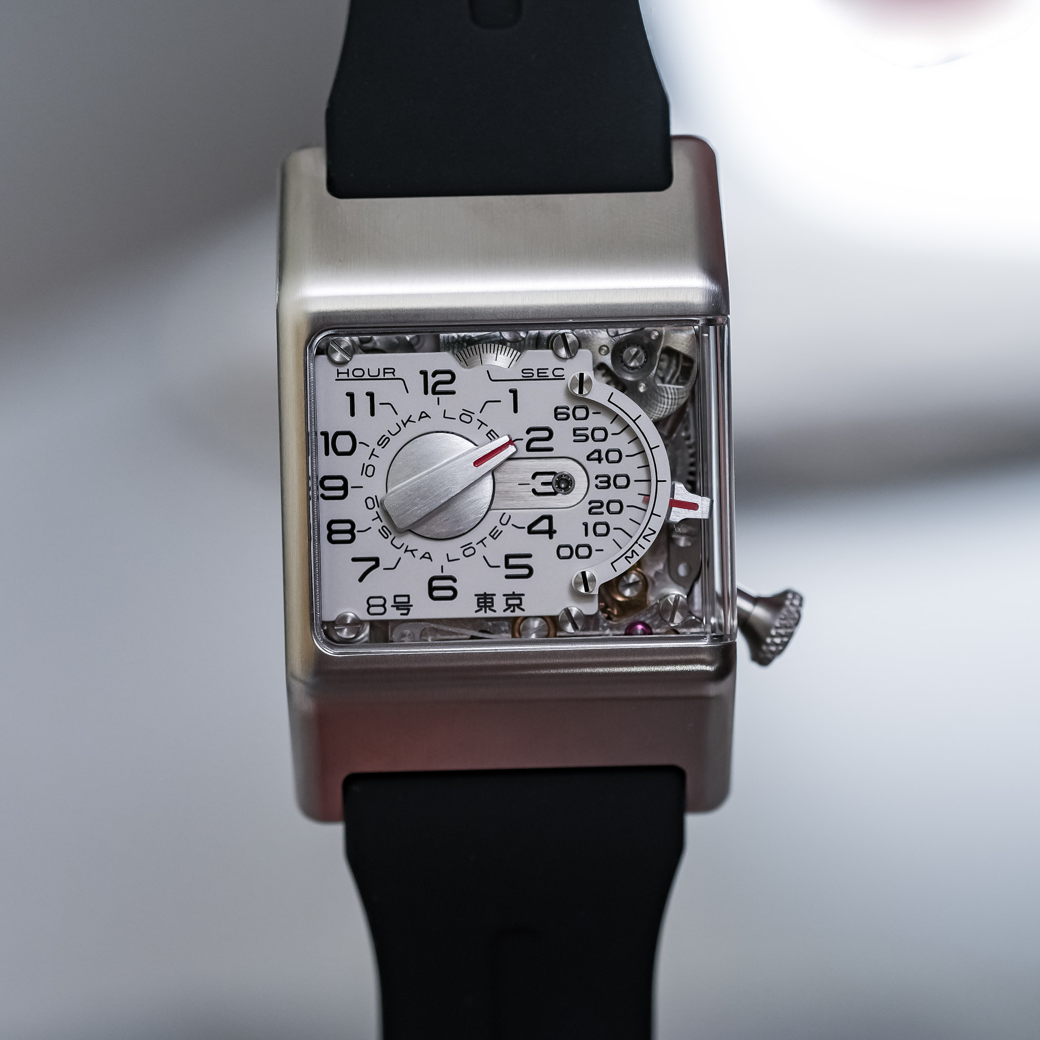 The black rubber strap is wide (24mm) and visually integrated into the case. Comfort is good, as the rubber’s flexibility compensates for the case’s rigid geometry. The Otsuka Lotec No.8 takes the retrograde logic of the No.6, the mechanical theatre seen in the No.9, and the experimental spirit of the No.5 KAI and No.7.5, and merges them into a more focused object.