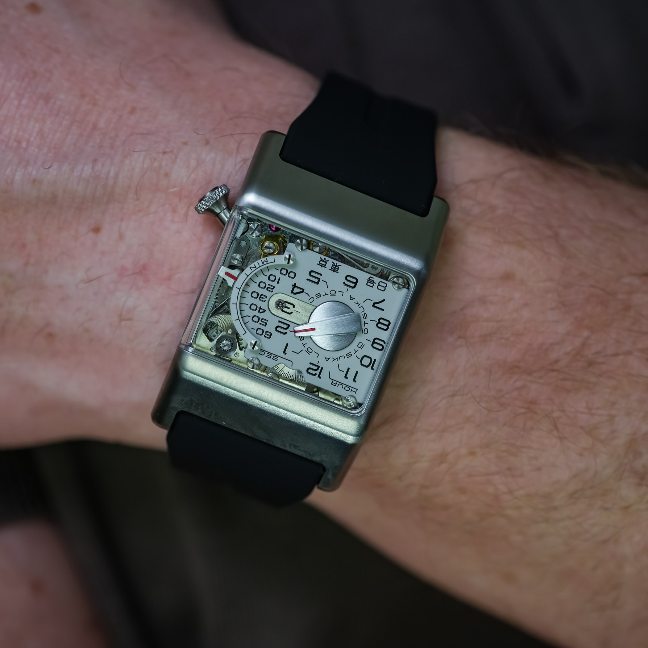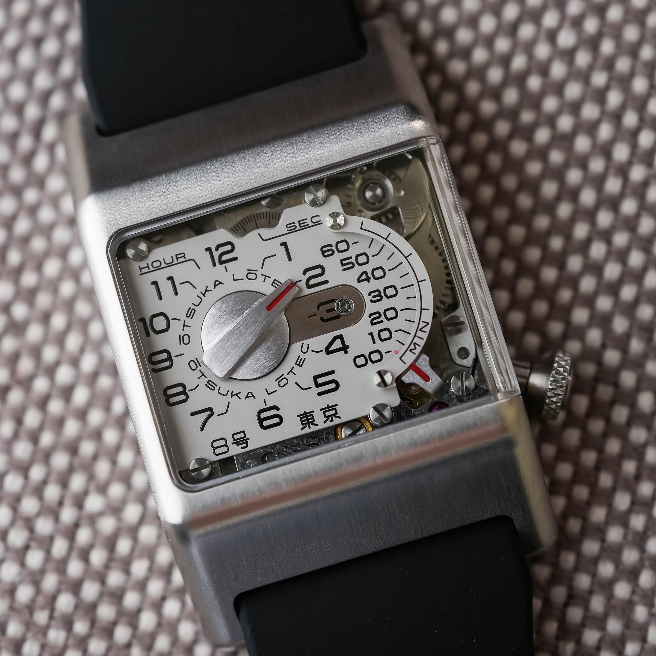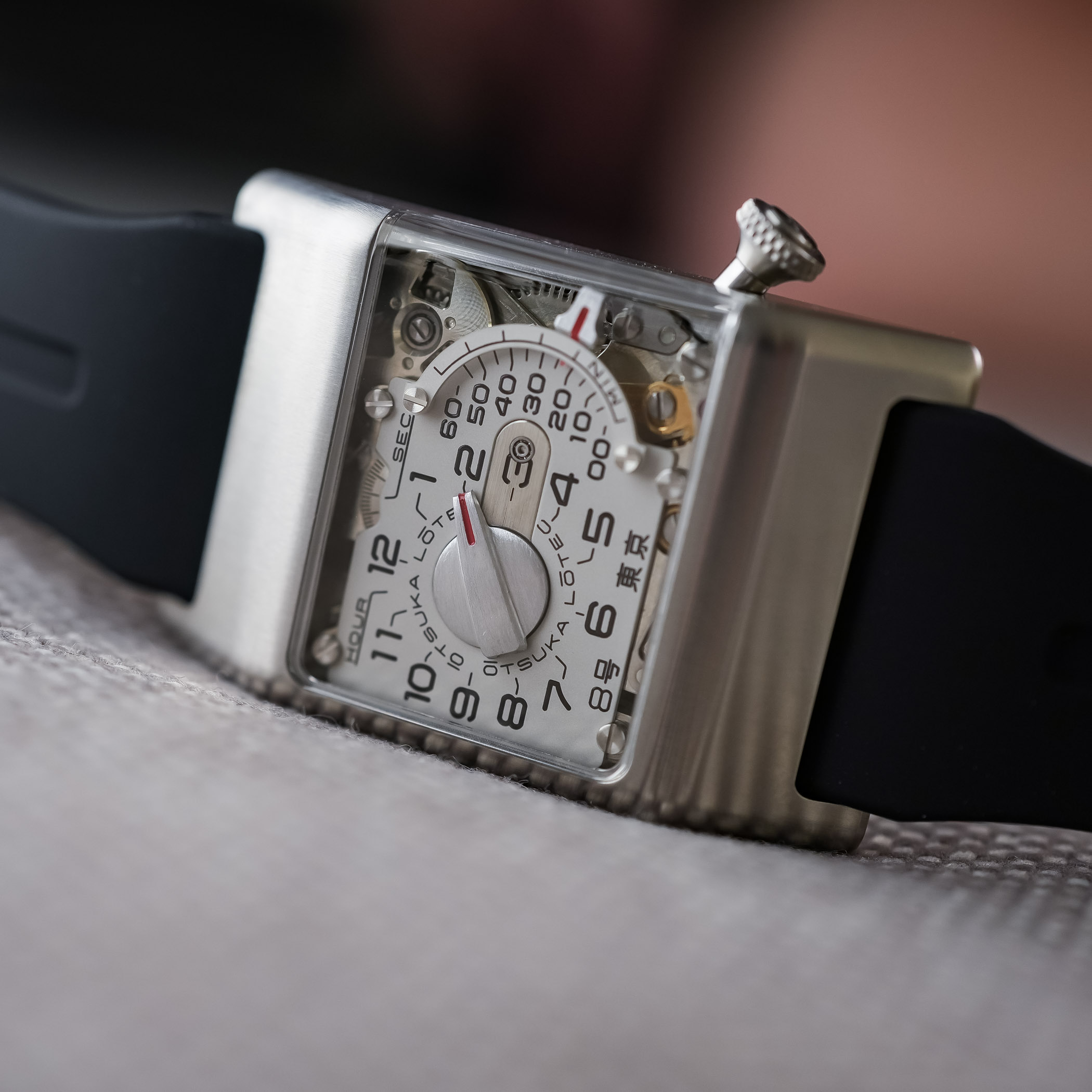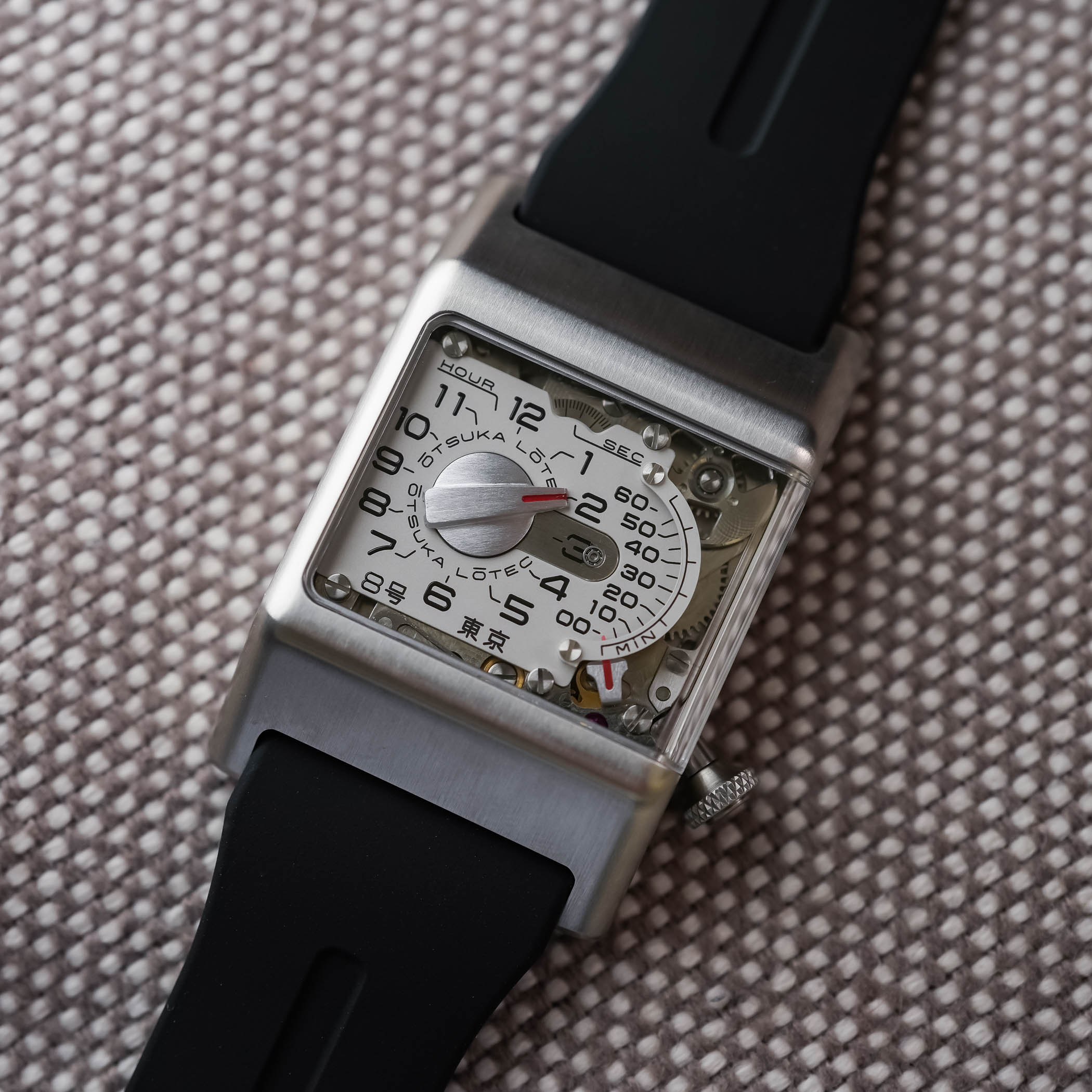 The black rubber strap is wide (24mm) and visually integrated into the case. Comfort is good, as the rubber’s flexibility compensates for the case’s rigid geometry. The Otsuka Lotec No.8 takes the retrograde logic of the No.6, the mechanical theatre seen in the No.9, and the experimental spirit of the No.5 KAI and No.7.5, and merges them into a more focused object.