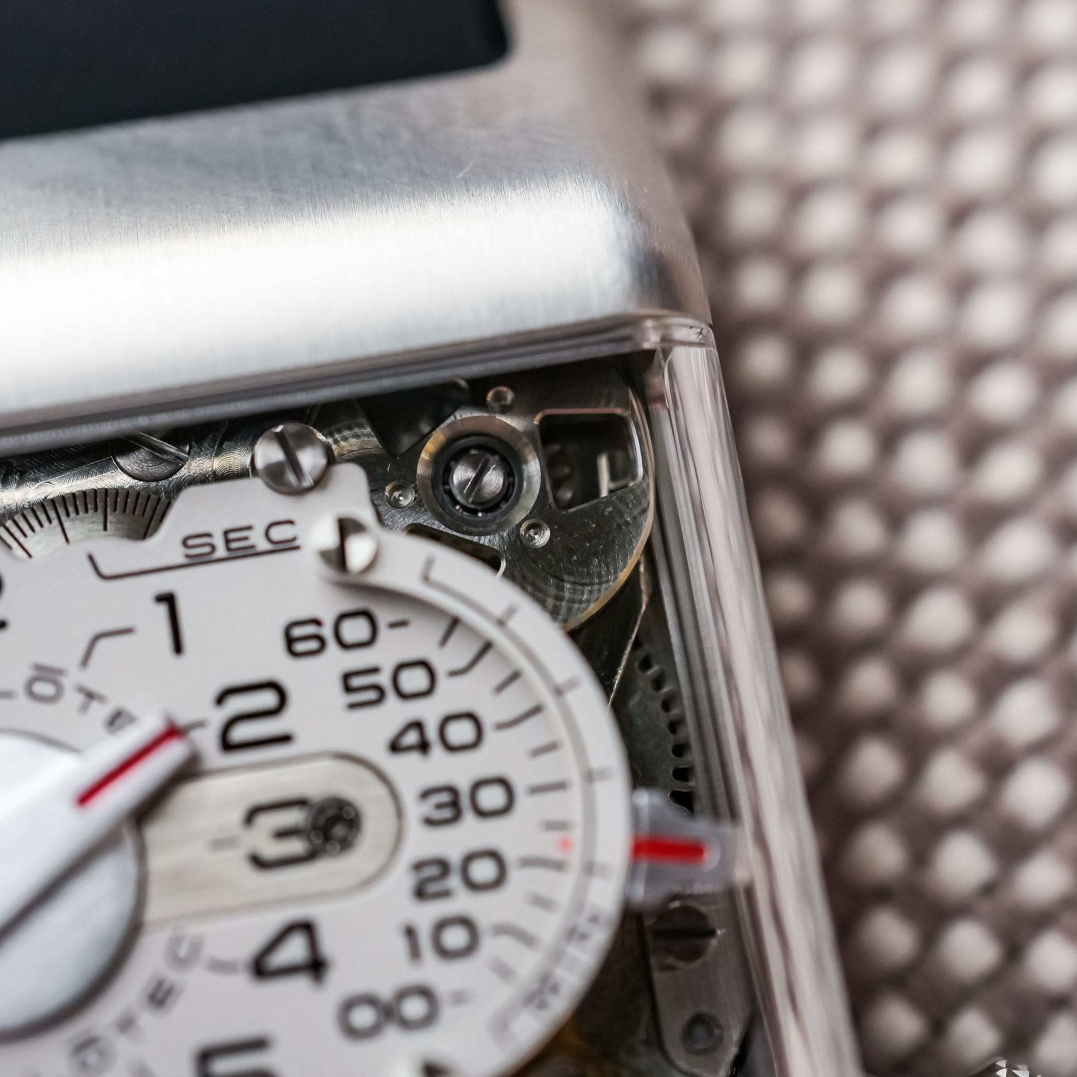 Part of the revealed mechanism, at the top right, is a visible flywheel. Instead of a snap, the return is controlled, almost dramatic. When the minute hand returns to zero, the hour disc jumps to the next hour. The action is nearly audible (it will be in a quiet room) and slightly slowed down for effect. It invites observation. Legibility, despite the unconventional layout, is surprisingly immediate.