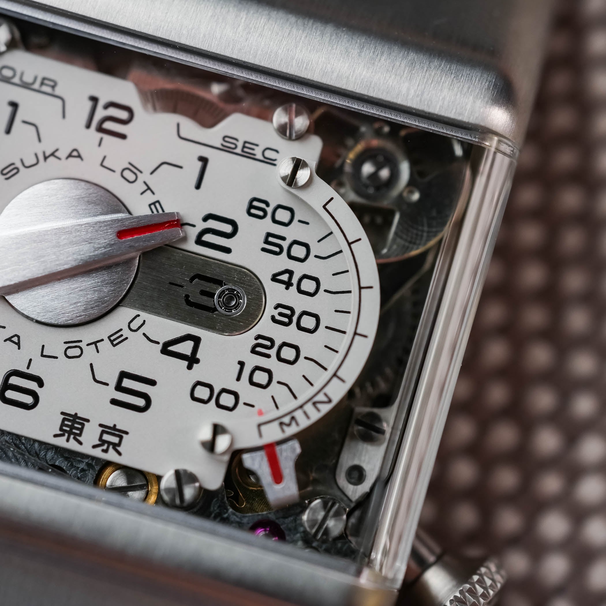 To call what we see under the sapphire crystal a dial would be slightly misleading; what the Otsuka Lotec No.8 displays is more like an aluminium control panel, with a top plate above the moving parts below.
