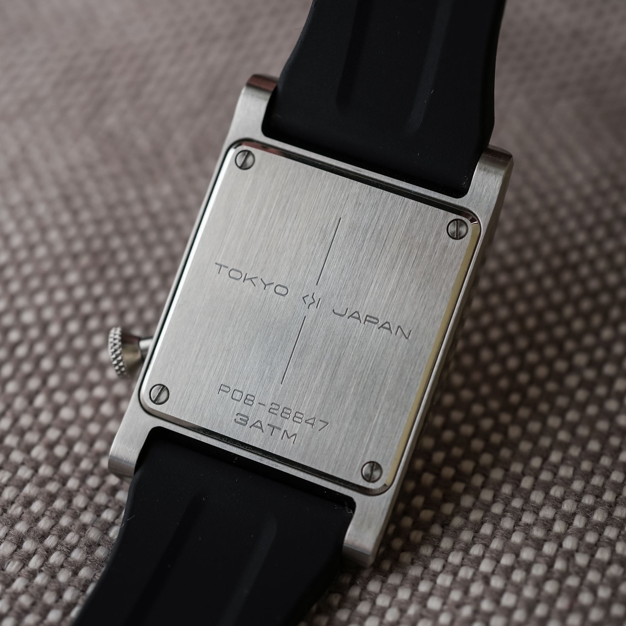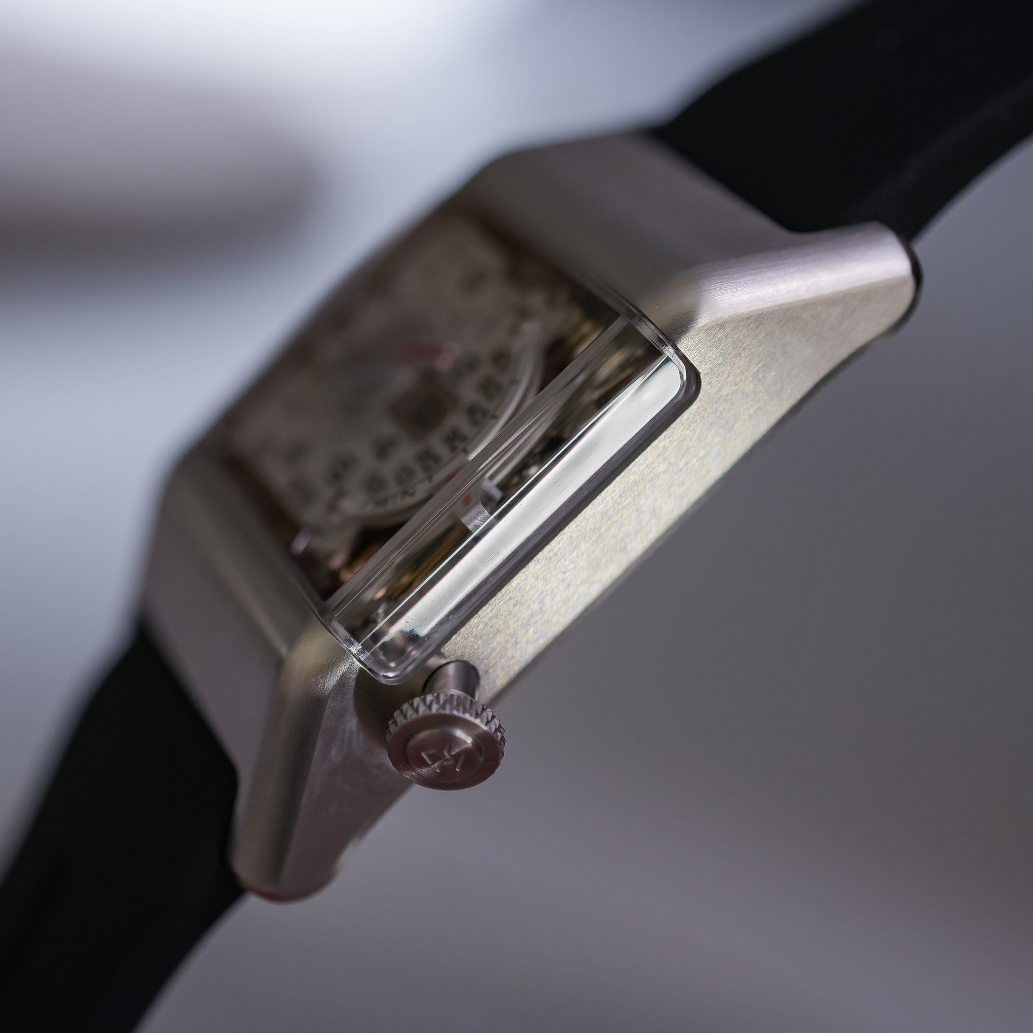 The case is straight-grained throughout, with no polishing to soften edges, a deliberately near-raw finishing, and no attempt to disguise the machining marks. Even though the watch feels closer to a milled component than a luxury object, there’s undeniable finesse about it. The crown at 4 o’clock is small and tactile, a functional knob, positioned to aid ergonomics, while the caseback is solid, with four screws to hold it in place. On the wrist, the watch sits quite flat, and the rubber strap anchors the case nicely, like an instrument.
