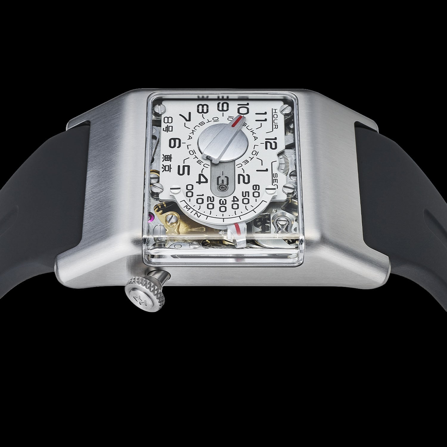A “simpler” watch with a Miyota base calibre at its core, the Otsuka Lotec No.8 feels like the natural continuation of the previous No.5 Kai, No.6 and No.7.5, and yet somehow adds some of the No.9’s cues into the equation. As for the overall design, we’re once again looking at an horoligical UFO, mixing modernism and industrial vintage inspiration, like a vision of a modern item in a 1970s or 1980s movie – this watch would have looked perfect in the original 1982 Blade Runner movie. The case, made of straight-grained steel, is rectangular with facetted top surfaces, measuring 31mm in width and just under 48mm in length. Thickness is under control at 10.8mm, and the watch retains the classic, deliberately rough-looking crown at 4 o’clock and a curved sapphire crystal opening the view on the right side.