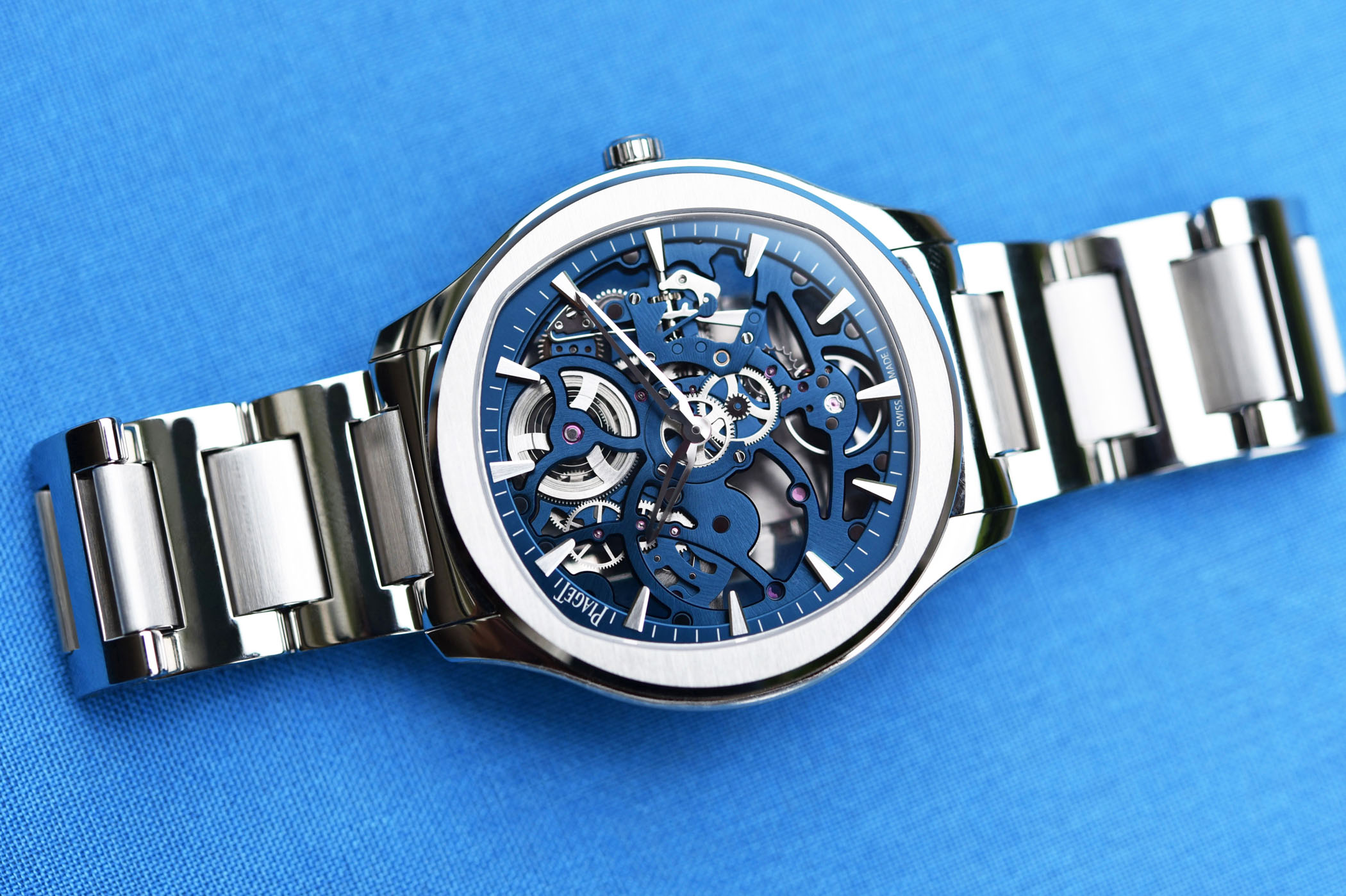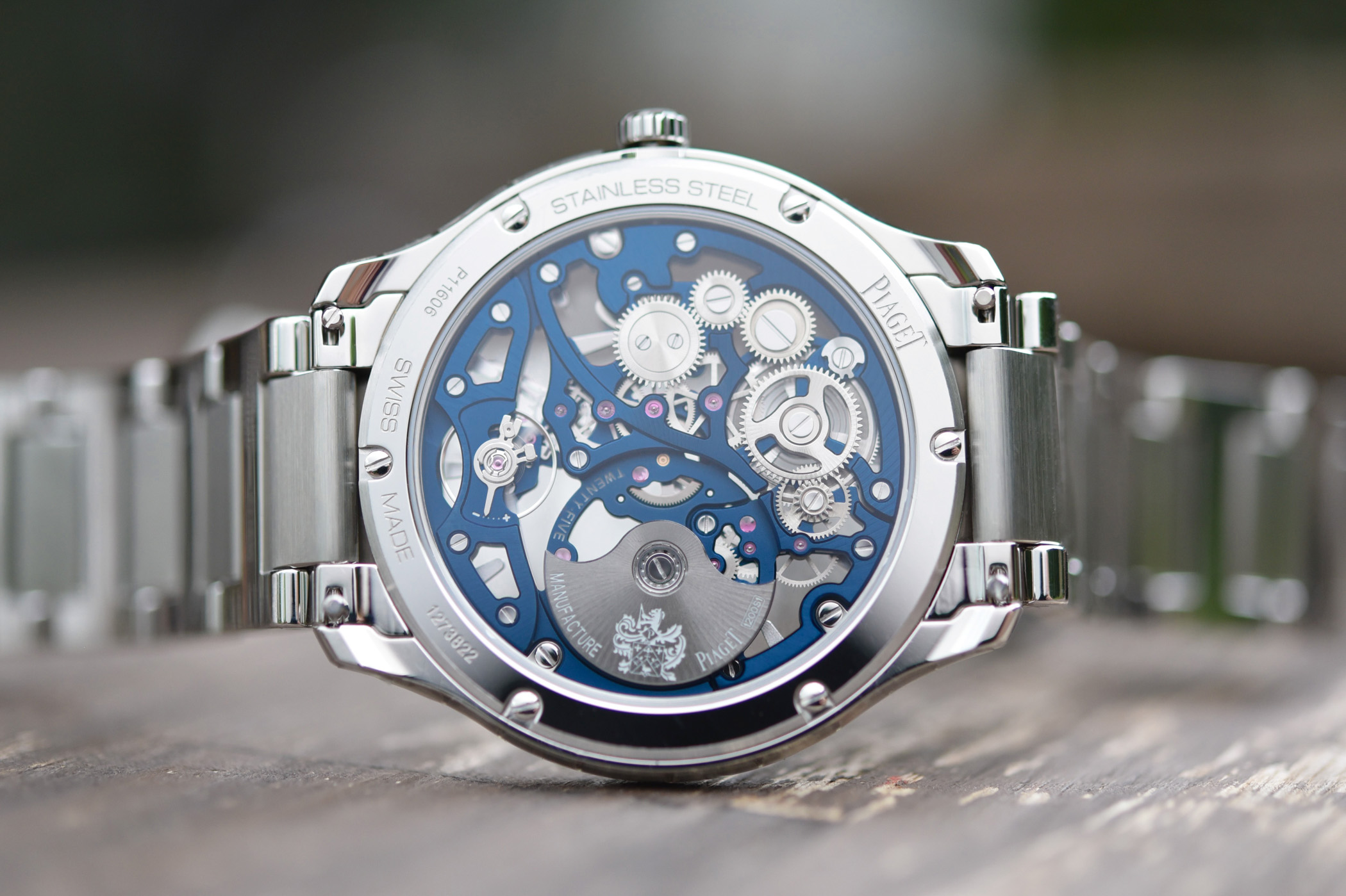 Quick Facts: 42mm diameter x 6.5mm height – stainless steel case – 30m water-resistant – calibre Piaget 1200S, in-house – automatic with micro-rotor, openworked (available in blue or grey) – H-shaped stainless steel bracelet and colour-matching alligator strap, with interchangeable device – CHF 28,700