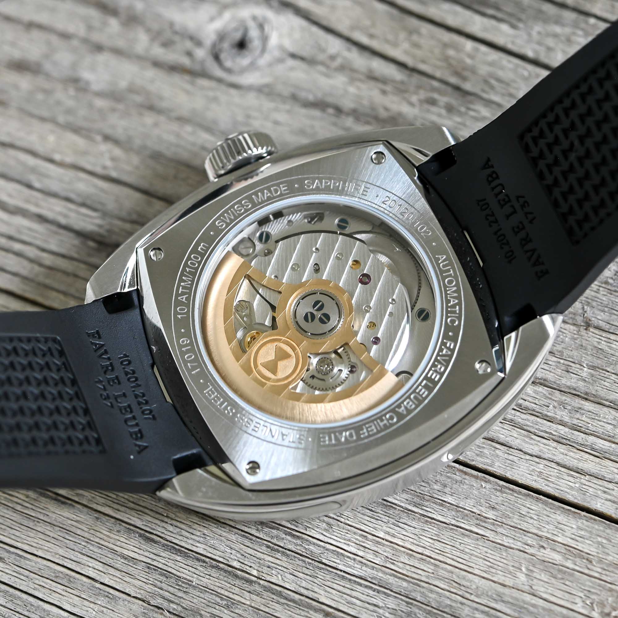Turning the watch over, the exhibition case back allows you to discover the automatic L112 (just like for the Sea Sky) – this integrated column-wheel chronograph beats at 4Hz and its power reserve is of 60 hours. Its finishes include Côtes de Genève stripes, blued screws, a circular-grained barrel bridge, and polished steel components. The Favre Leuba Chief Chronograph is available in black, blue or ice blue – either on an H-link steel bracelet or on a rubber strap.