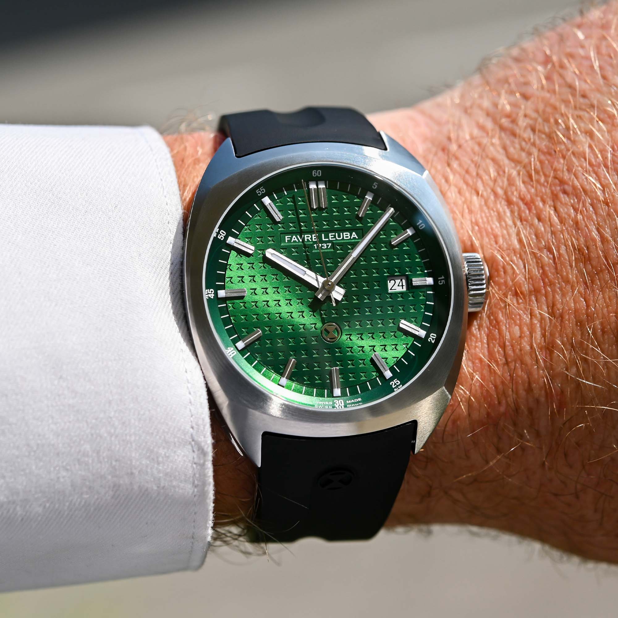 The Date version comes in a 40mm case housing there again the automatic La Joux-Perret G100 that can be seen via the exhibition case back. The textured dial features a stamped tapestry with high-relief hourglasses paired with applied markers, which creates a pleasing sense of depth. It is available in green, black or blue. The Favre Leuba Chief Date is available either on an integrated H-link steel bracelet or on a rubber strap.