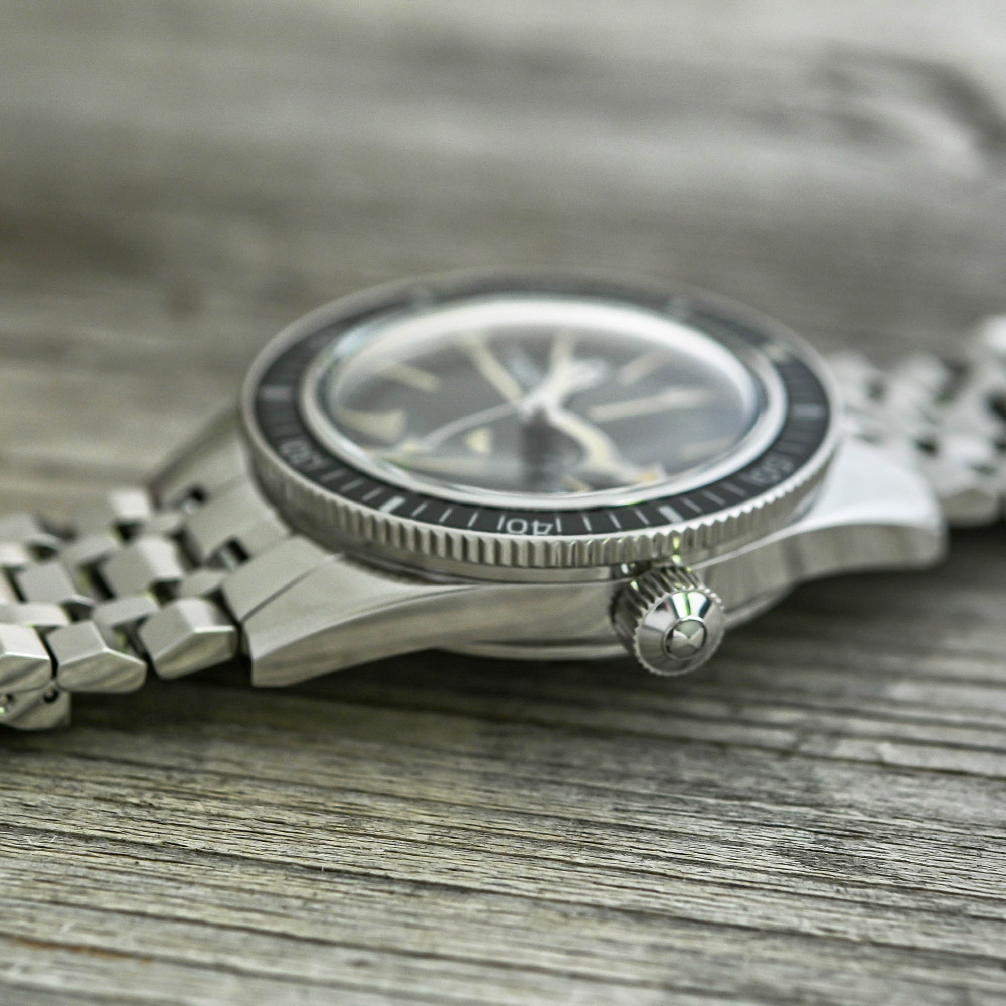 A MONOCHROME favourite, the Deep Blue Revival is a faithful yet modernized reissue of the classic model. The stainless-steel case retains the original 39mm diameter, upgraded with a 300m water resistance. The unidirectional bezel is now fitted with a sapphire insert printed on the back. The sunray-finished grey crosshair dial, features a round-date window and baton-shaped markers. It is accented with egg-shell coloured Super-LumiNova that evokes the vintage radium glow, adding a nostalgic touch to the design.