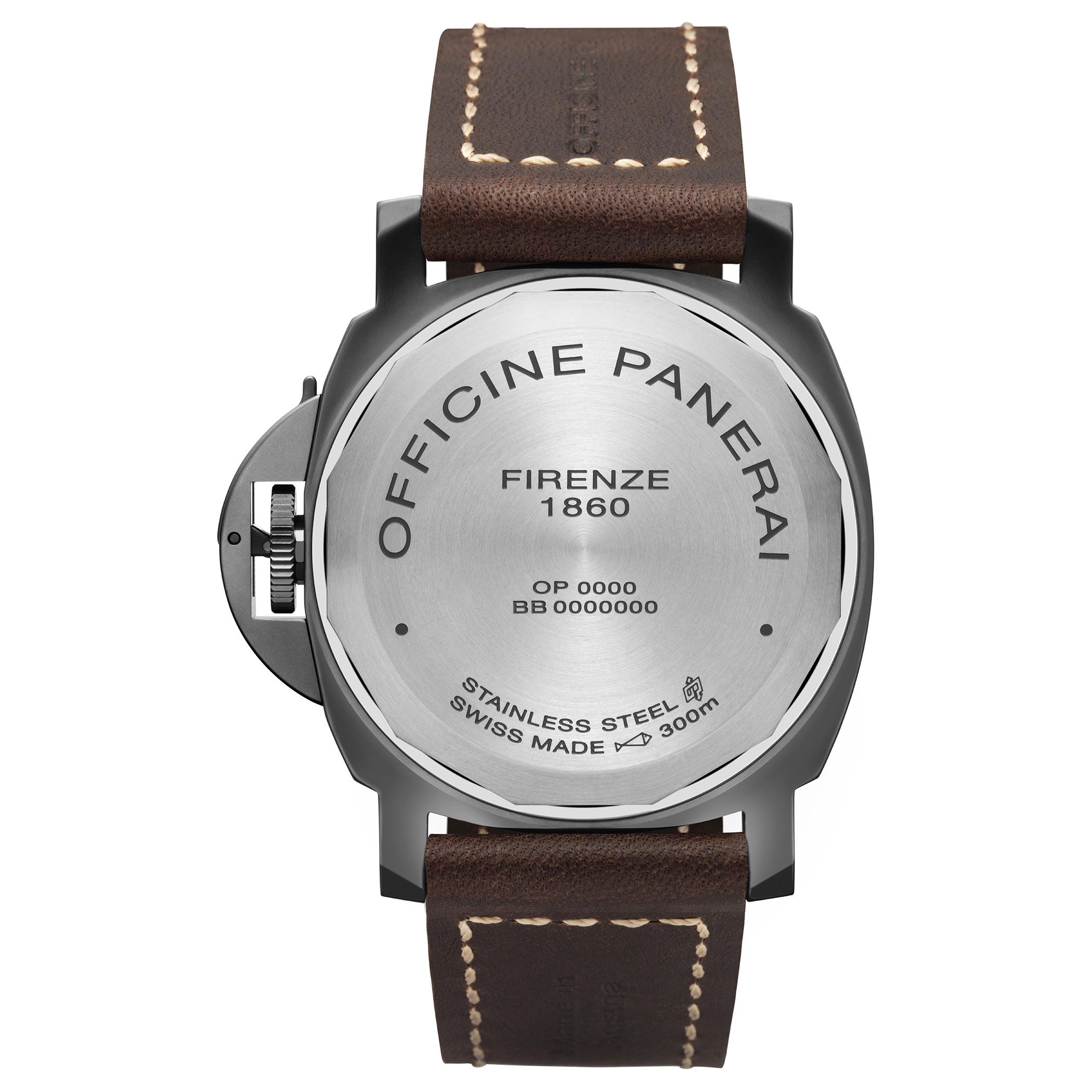 The base for this PAM00779 is the utilitarian-looking Luminor case, measuring here 44mm (the intermediate, almost wearable case size at Panerai) and crafted in titanium to be lightweight and resistant. To give the watch a more modern, less precious feel, the case is coated with DLC (Diamond-Like Carbon), an even carbon-based layer which gives the metal a uniform appearance, with a matt anthracite finish and greater hardness, resistant to scratches and corrosion.
