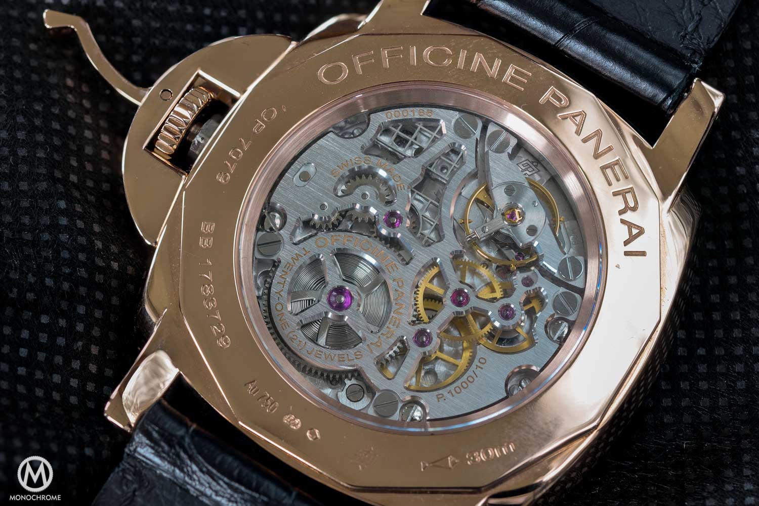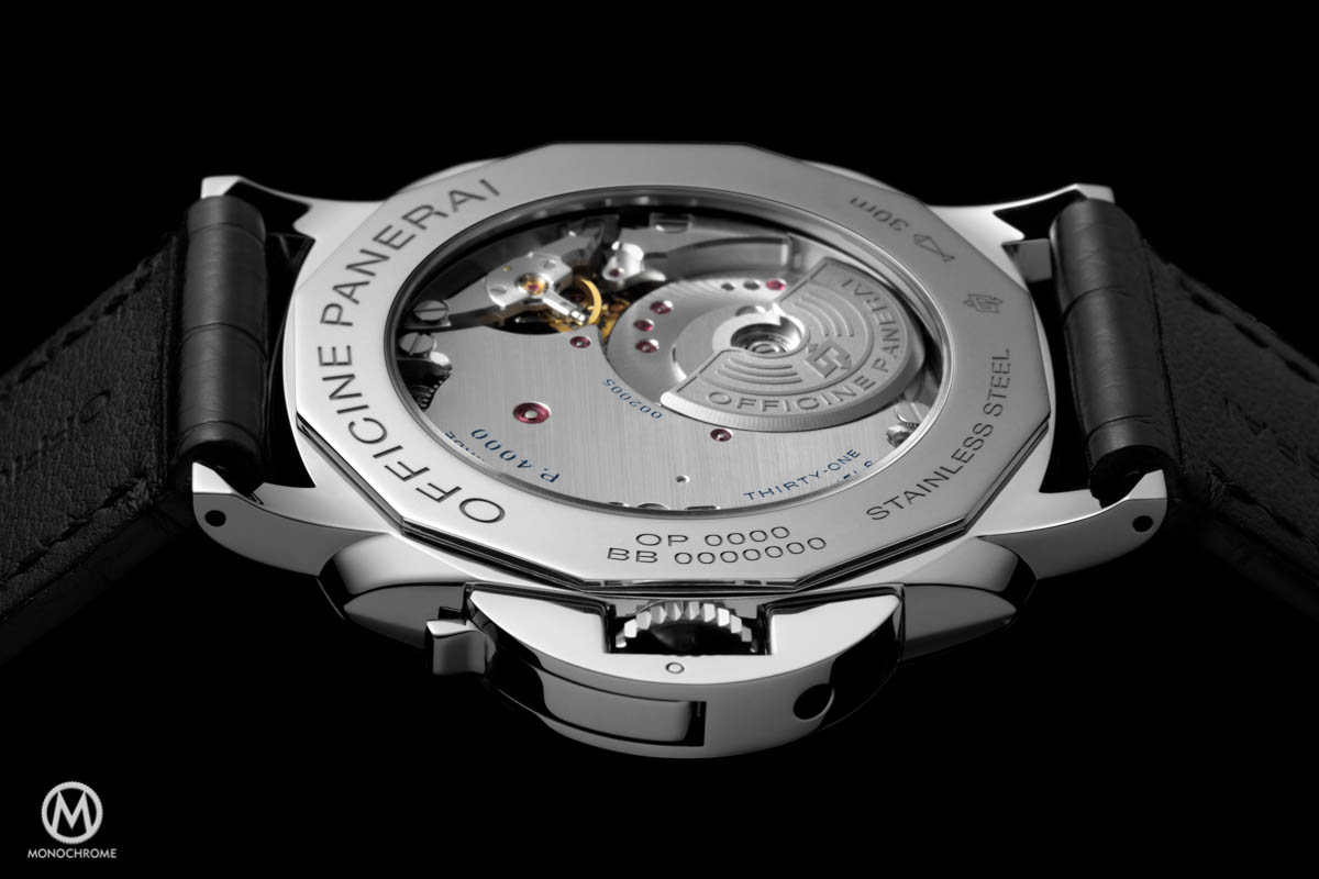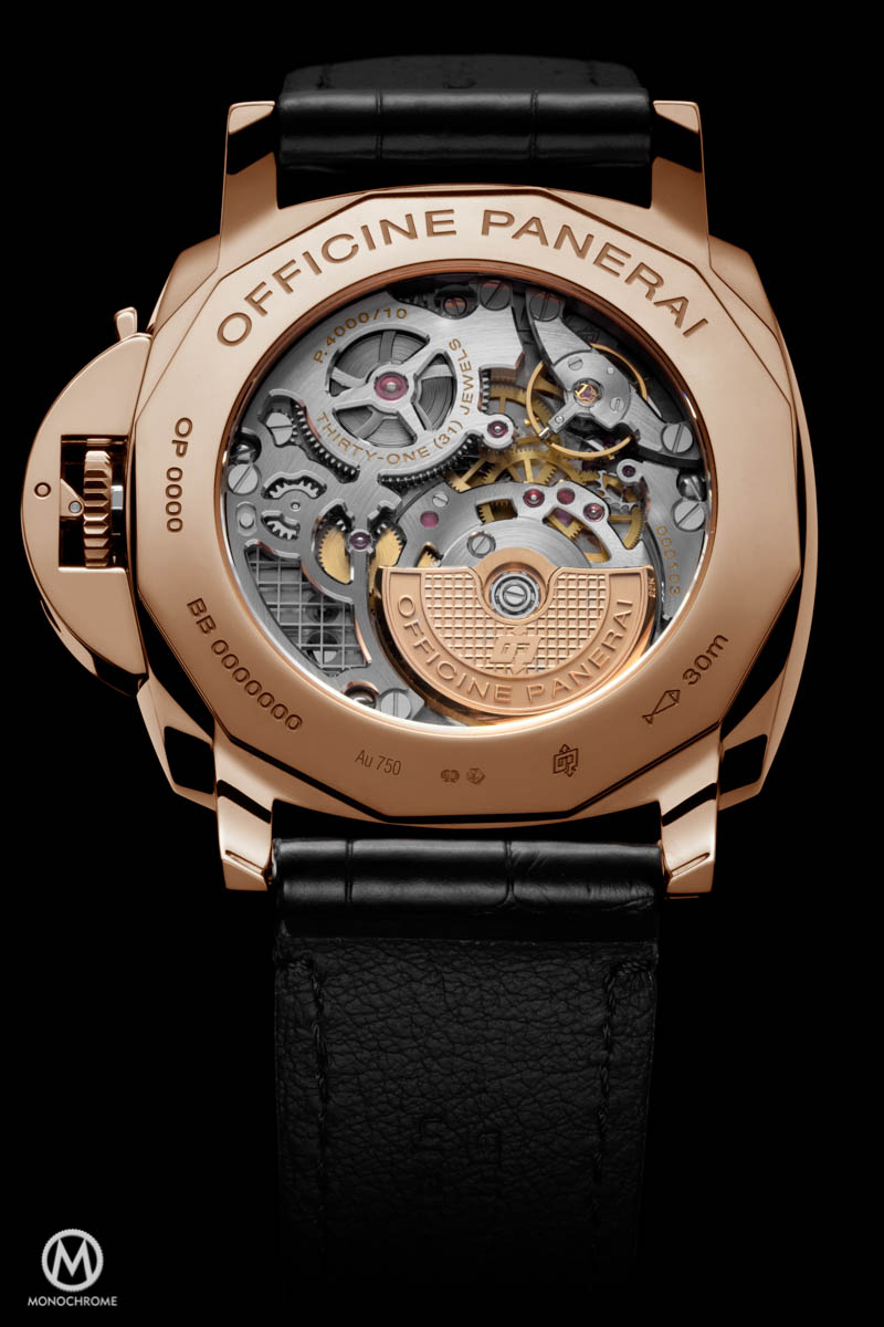The 45mm models are a tad higher than the 42mm versions: 10,70mm instead of 10,50mm. The new P4000 movement is the thinnest automatic movement developed by Panerai, thanks to its embedded off-center micro rotor which rotates in both directions. The movement also has two mainspring barrels to facilitate the 3-day power reserve and a sturdy balance bridge. Again something that we applaud is that the P4000 movement also features the zero-reset function. In the red gold version, the bridges have a circular brushed finish and gilded engraving while the 22-carat gold oscillating weight features Clous de Paris decoration.