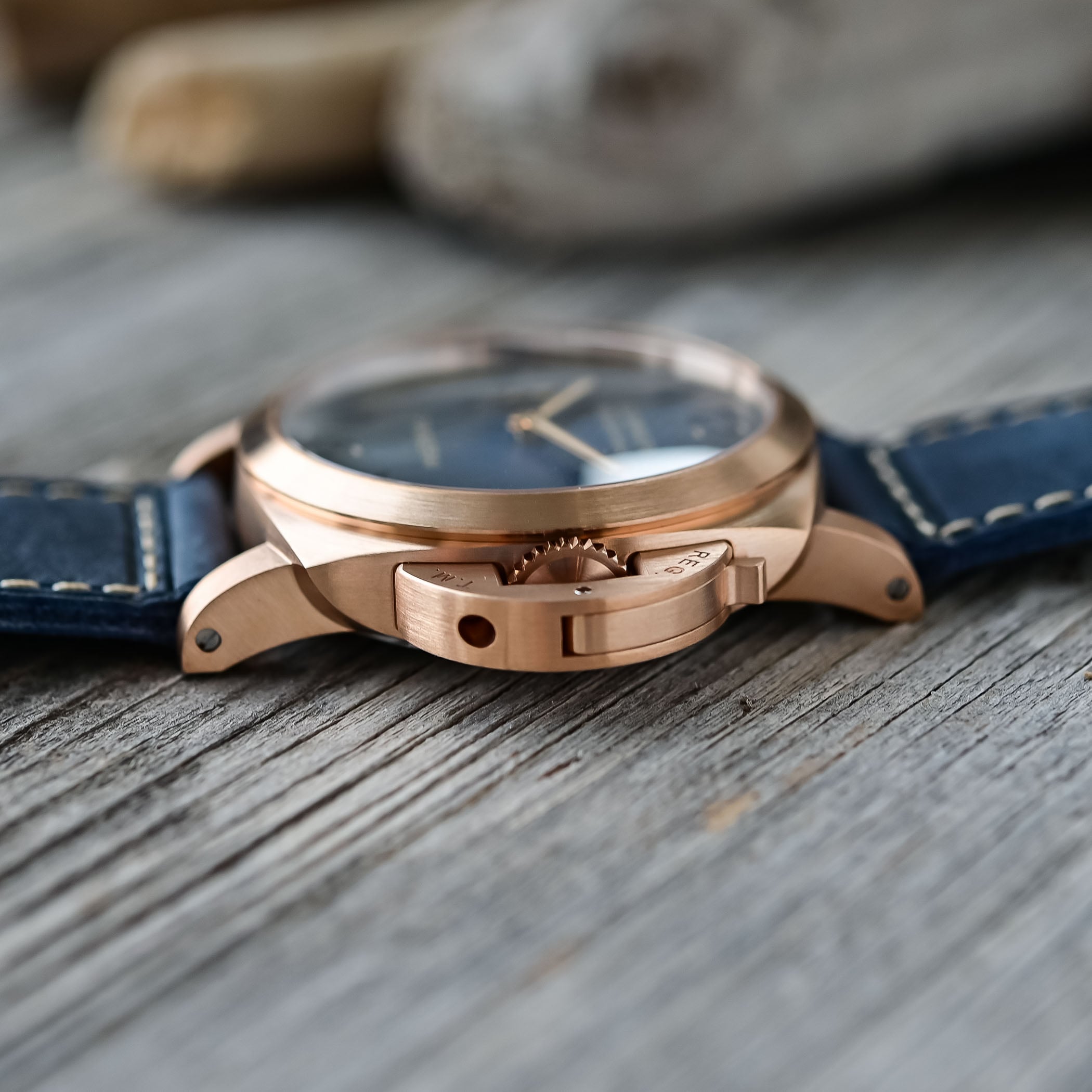 The matte blue gradient dial echoes the sea-inspired spirit of the design, in Panerai’s signature sandwich construction, gradating from a deep navy at the edges to a lighter blue at the centre, complementing the warm bronze tones. Beige Super-LumiNova fills the cut-out Arabic numerals and hands, ensuring great legibility in the dark, while the small seconds sub-dial at 9 o’clock maintains the series’ functional symmetry. The dial omits an indication of a date for a clean, historically faithful layout.