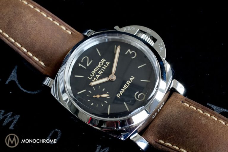 The 42mm and 44mm cases of the PAM00977 and PAM00978 are made in 316L stainless steel, the most commonly used steel in the watch industry. That’s because the 316L steel alloy is very resistant to corrosion. Besides the diameter, there’s no mention of other measurements, however, it’s safe to assume that the 42mm Luminor Marina watches is approx. 13mm thick and the 44mm version measures approx. 15.5mm. Depth rating of the 42mm version is 10ATM or 100 metres, while the 44m version has the proper depth rating for diver’s watches, namely 300 metres.
