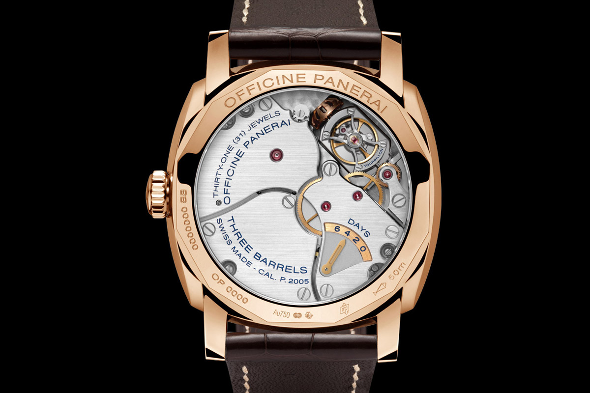 - Movement: hand-wound mechanical, Panerai P.2005 calibre, executed entirely by Panerai, 16¼ lignes, 9.1 mm thick, 31 jewels, Glucydur® balance, 28,800 alternations/hour. KIF Parechoc® anti-shock device. Power reserve 6 days, three barrels. 239 components.