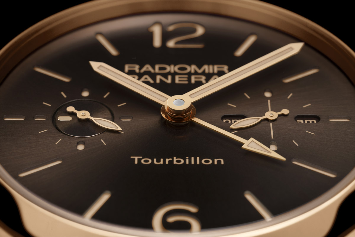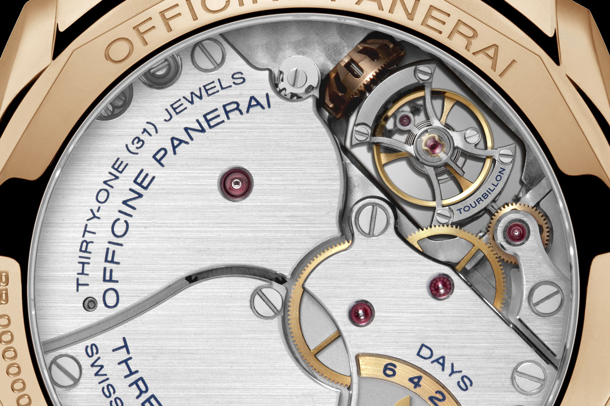 Panerai is know for its rugged, large, massive and now iconic dive watches. Inspired by 1940s and 1950s editions, all of them share the same DNA. What especially differentiates the watches from the Officine are the materials used for the cases and the movements. Some of them relies on simple ETA 6497 but most are using in-house calibres now. And some are using superb manufacture movements. Take a look at the Panerai Radiomir Platino and Oro Rosso 47mm Special Edition or the Panerai Radiomir 1940 Chronograph and you’ll understand our definition of superb. OK, both are using some of our favorite movements, some Minervas, known for their glamorous curves. With the Radiomir 1940 Tourbillon GMT Oro Rosso PAM558, Panerai prefers to keep the game modern – at least for the movement – and encloses a P2005 into its new limited edition.