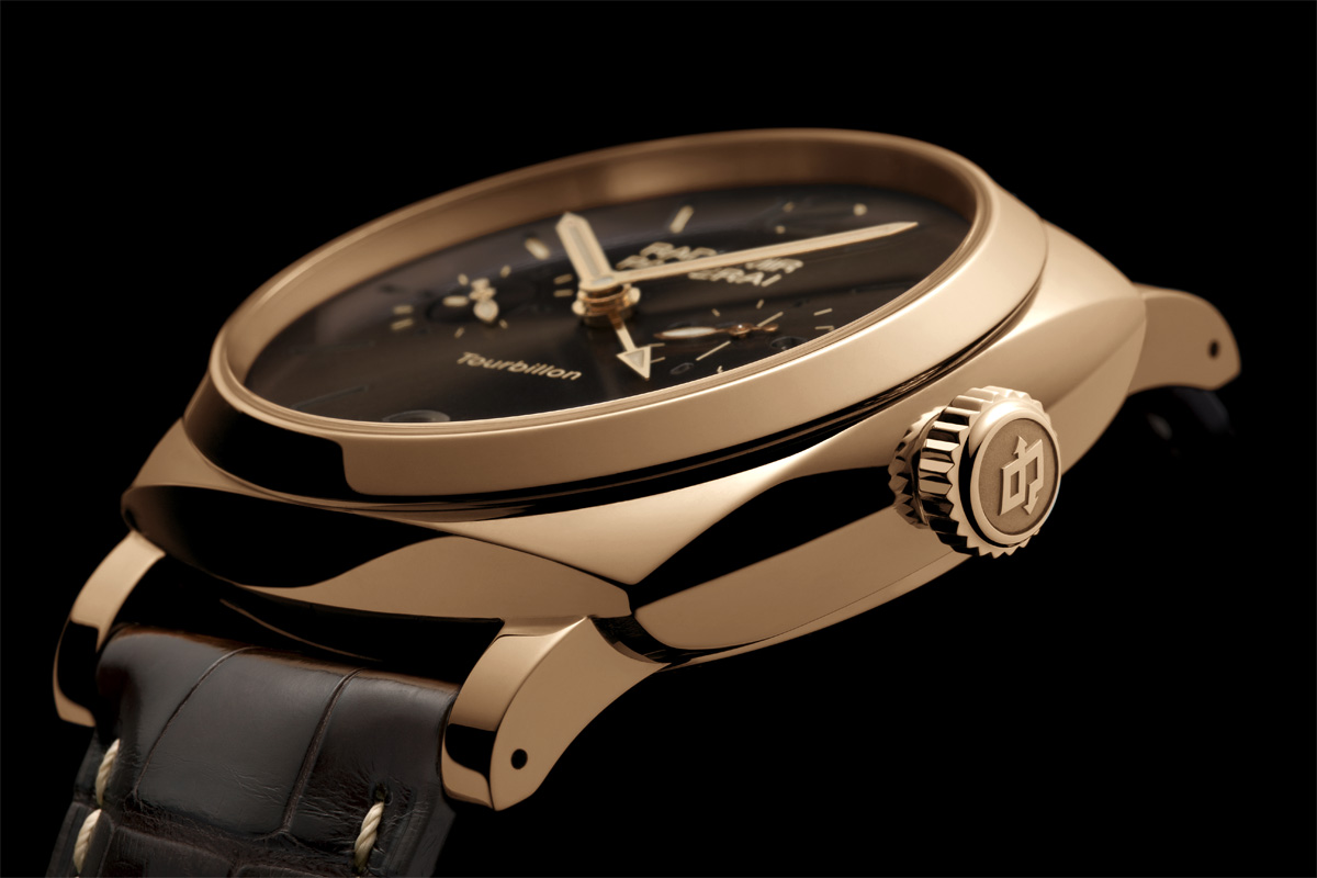 - Dial: Brown, with luminous Arabic numerals and hour markers. 24h indicator at 3 o’clock, seconds and tourbillon indicator at 9 o’clock.