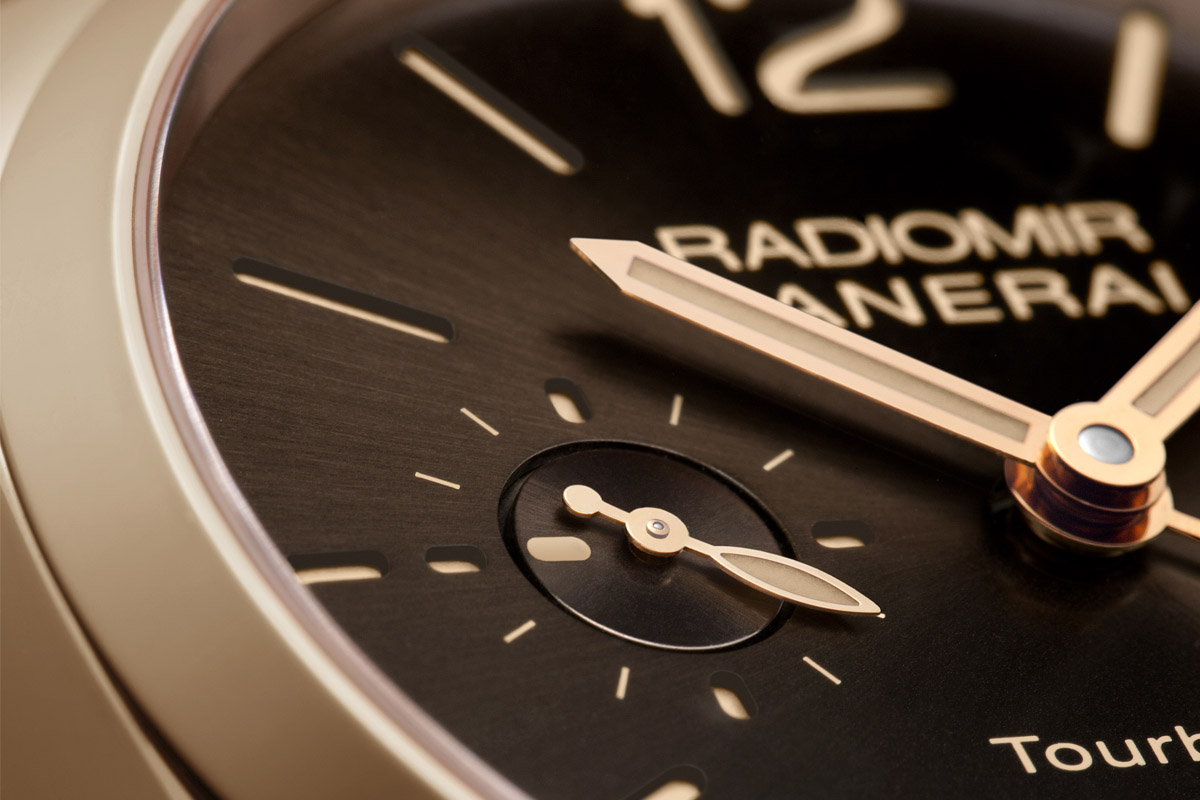Talking about mechanics, the front shows also some interesting features, with a GMT hand located on the central axis, a second time-zone at 3 (with AM / PM indication) and a small second at 9 (inside this subdial is a rotating tourbillon indicator). The GMT hand can be adjusted by one-hour increments directly by the screwed crown, without disturbing the seconds or the minutes. The dial comes with Panerai’s iconic sandwich structure. The Panerai Panerai Radiomir 1940 Tourbillon GMT Oro Rosso PAM558 has a nicely grained face, with a brown satin sunburst finish.