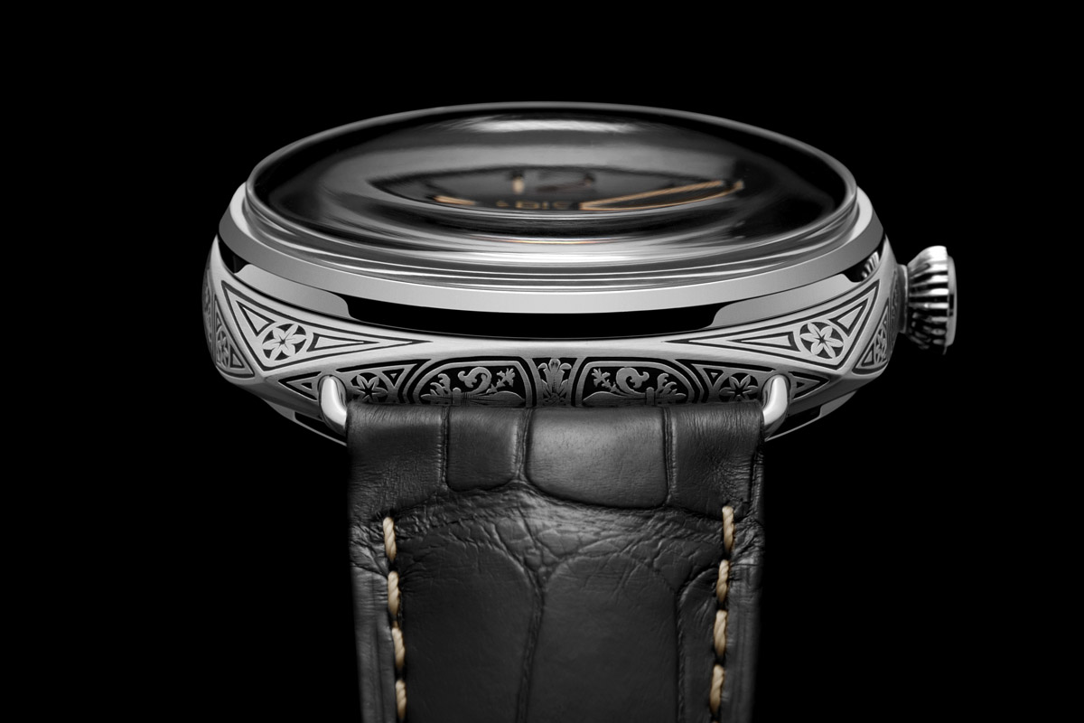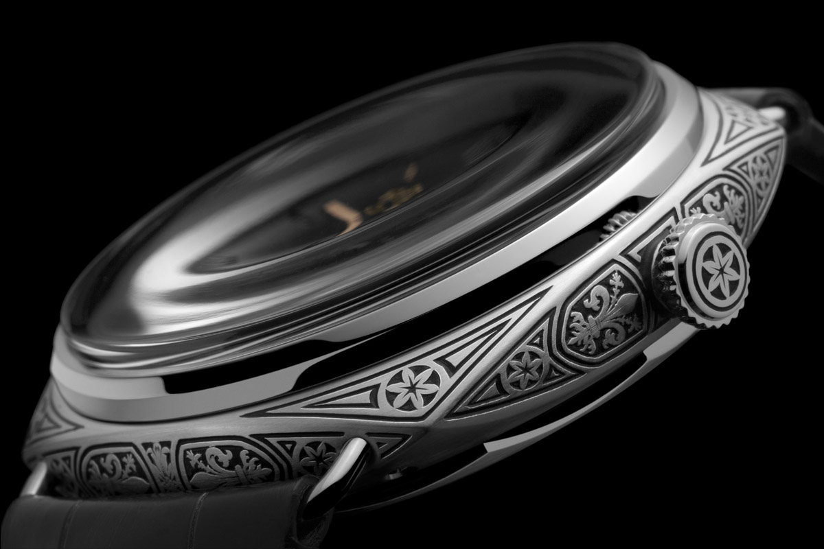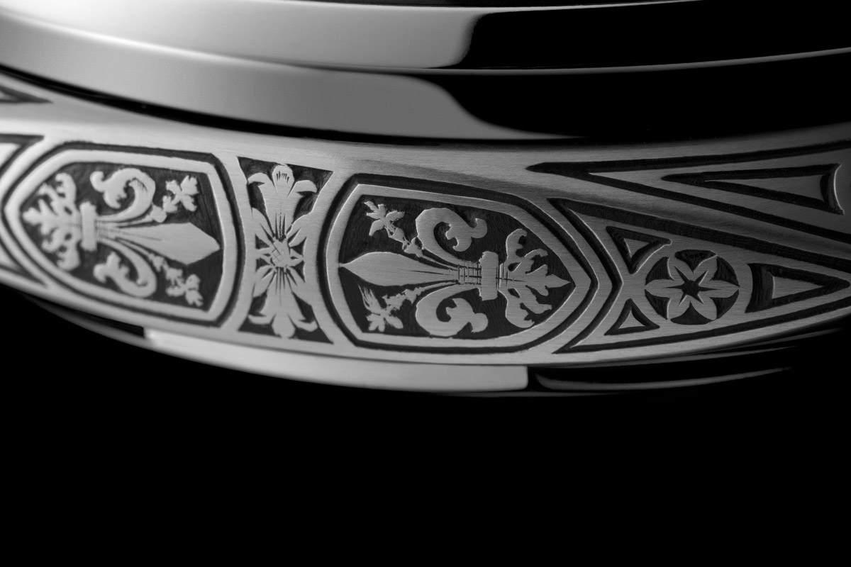 The engraving is entirely done by hand, and each case takes one craftsman more than a week to finish. The décor is engraved into a finished and assembled brushed steel case, leaving no room to the artisan for an error. Knowing how hard is steel (compared to gold or brass used for movement’s plates), the result is first visually appealing and mainly, it represents quite a technical achievement.