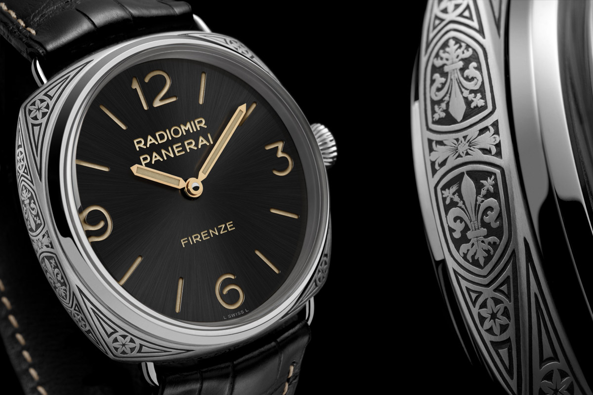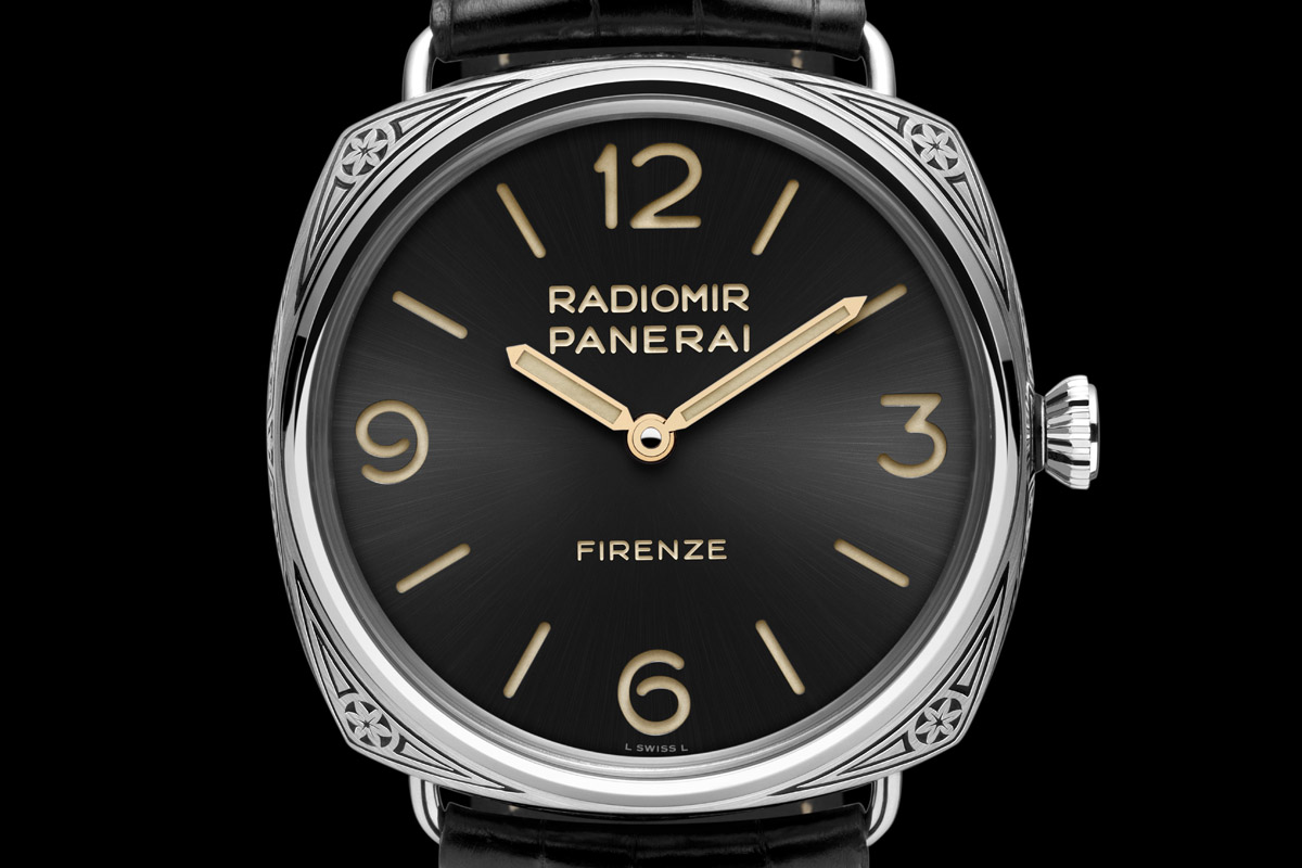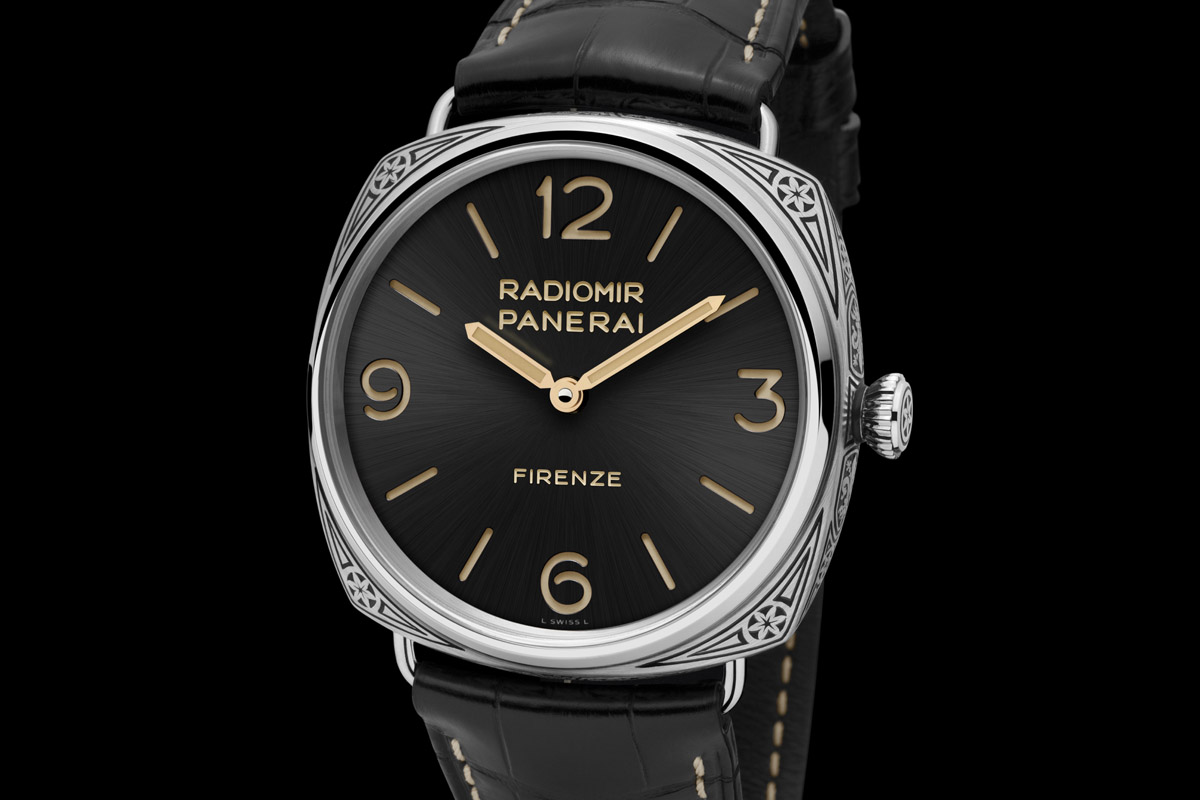 The new Panerai Radiomir Firenze 3 days Accacio 47mm PAM00604, a limited edition exclusively available at the Florentine Panerai Boutique, is engraved with a motif that is recurrent in Tuscan history. For instance, the Florentine Lily, originating in 11th century iconography, can be found on the case. It is part of the geometrical and floral motif, engraved into the case and crown.