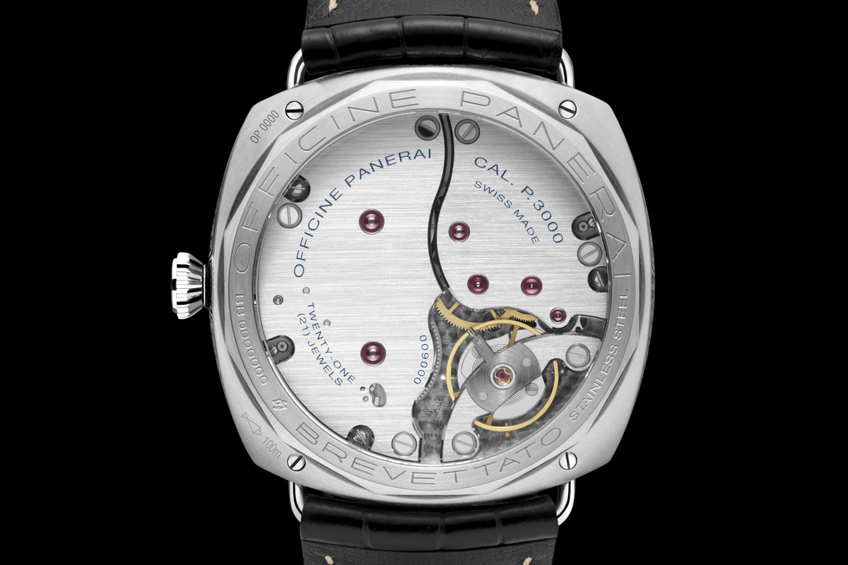 Inside ticks Panerai in-house calibre, the P.3000, which is visible through the sapphire case-back. The large plates of the movement obscure most of the view on the movement, but the balance wheel is visible under the small bridge in the lower right hand quarter. Two mainspring barrels, connected in series, provide 3 days of power as indicated in the name of the watch. The balance wheel, measuring 13.9mm in diameter, oscillates at a rate of 21,600 vibrations per hour. This same movement can be found in the PAM00557, the PAM00504 and the PAM327.
