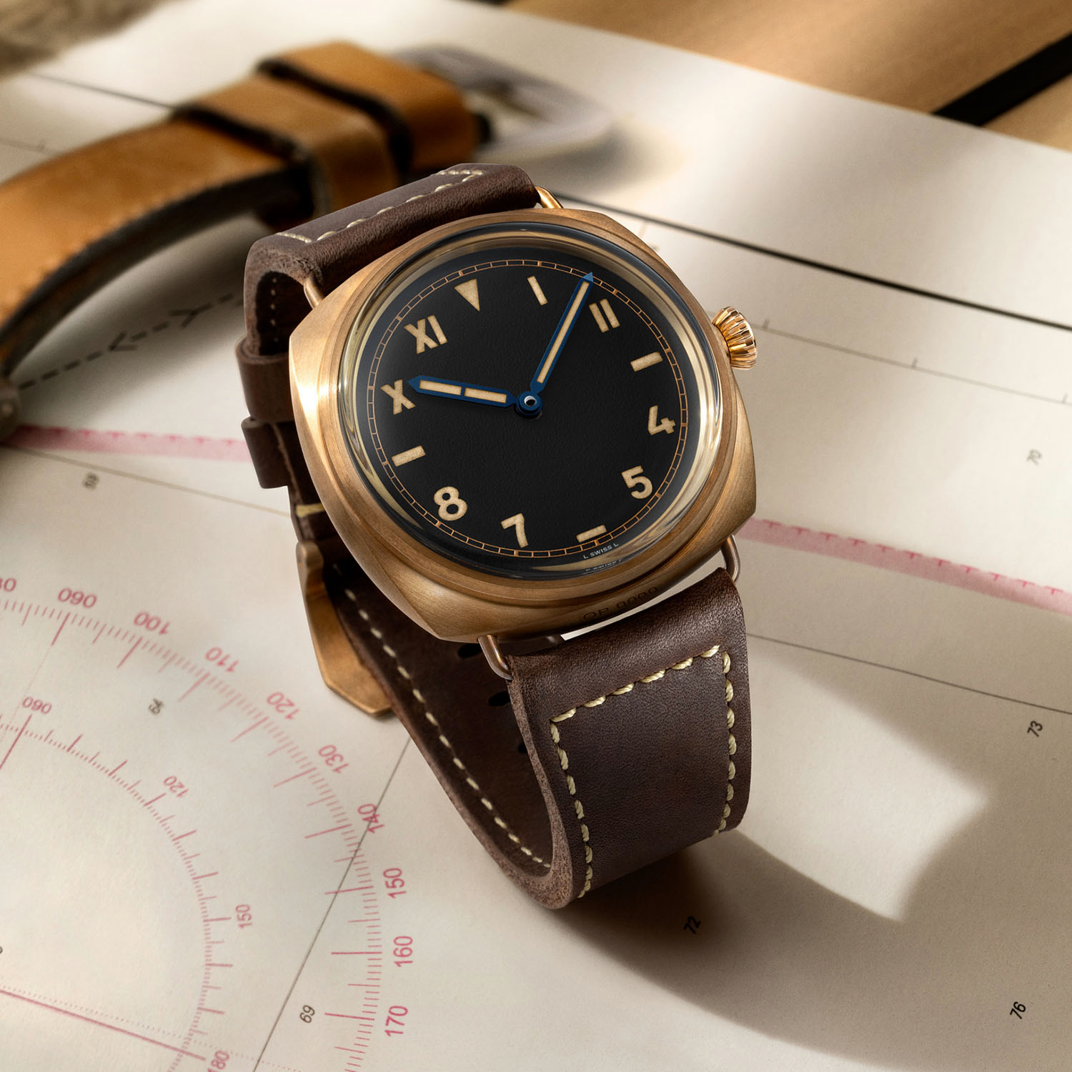 Quick facts: 47mm diameter – brushed bronze case, bezel and crown – domed PLEXIGLAS crystal – titanium exhibition caseback with sapphire crystal – wire lugs – water-resistant to 100m – Black grainy California dial with Roman and Arabic numerals – beige Super-LumiNova – blue burnished steel hands – minute track and bar markers – Panerai calibre P.3000 – hand-wound – 21 jewels – 21,600vph – twin barrels – 3-day power reserve – hours and minutes